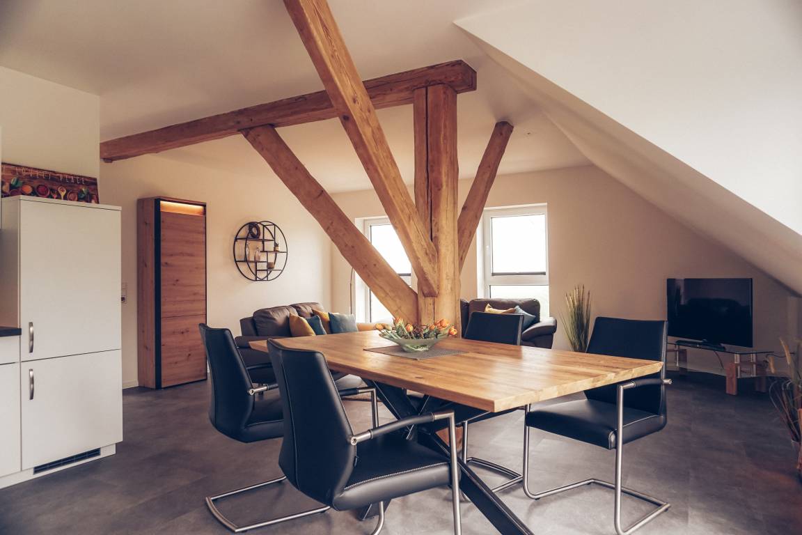 Besonderes Flair entsteht auch hier durch das offene Gebälk des alten Bauernhauses, welches optische Akzente setzt und zur gemütlichen Atmosphäre der Wohnung beiträgt. Bis zu 4 Personen können in dieser Wohnung den Urlaub genießen. Hierfür steht neben einem Schlafzimmer mit einem Doppelbett noch ein kleines Zimmer mit zwei Einzelbetten zur Verfügung. Ebenfalls gehört zu dieser Wohnung auch ein Balkon der Ihnen z. B. in den Abendstunden einen herrlichen Rückzugsort mit Blick auf die Weser bietet.