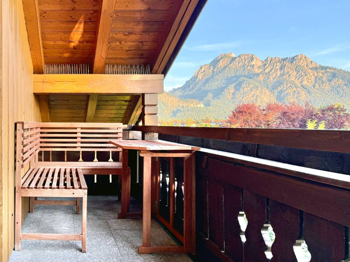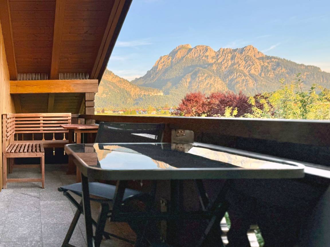 Genießen Sie den königlichen Schloss- und Alpenblick vom Süd-Westbalkon aus, direkt auf das Schloss Neuschwanstein.