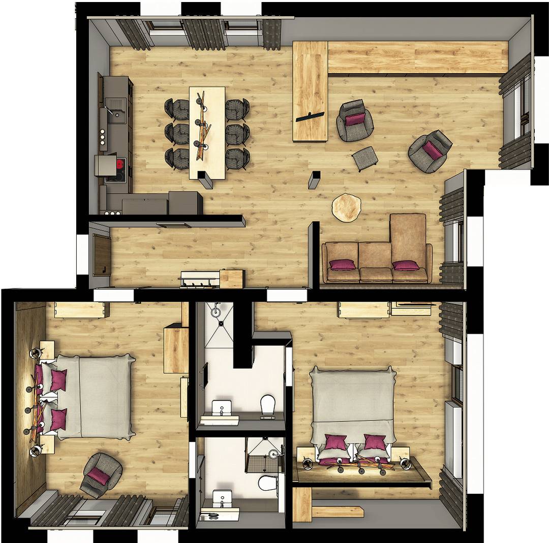 Großzügige Räume erwarten Sie im Apartment Deluxe Maximilian mit 90m² für bis zu 6 Personen und traumhaftem Blick auf die Berge und das Schloss Neuschwanstein. Zwei separate Schlafzimmer (Boxspringbett) mit jeweils eigenem Bad, ein großer Wohn-Essbereich mit Schlafsofa und gemütlichen Loungesesseln lassen keine Wohnwünsche offen.