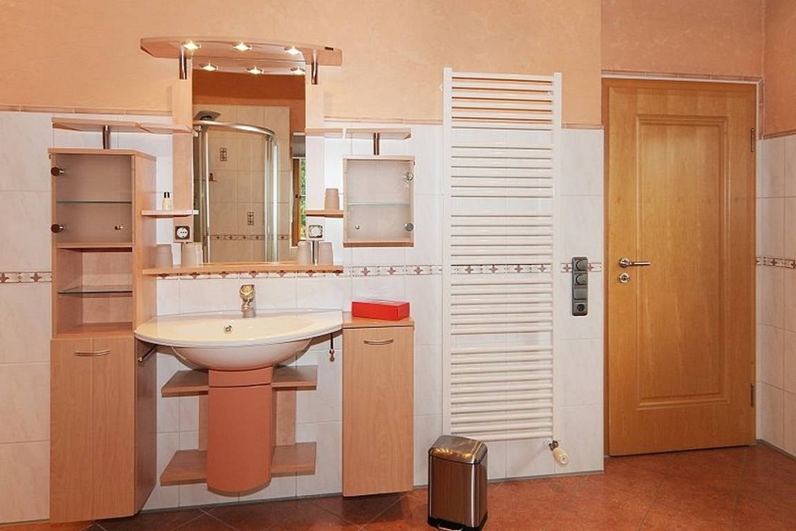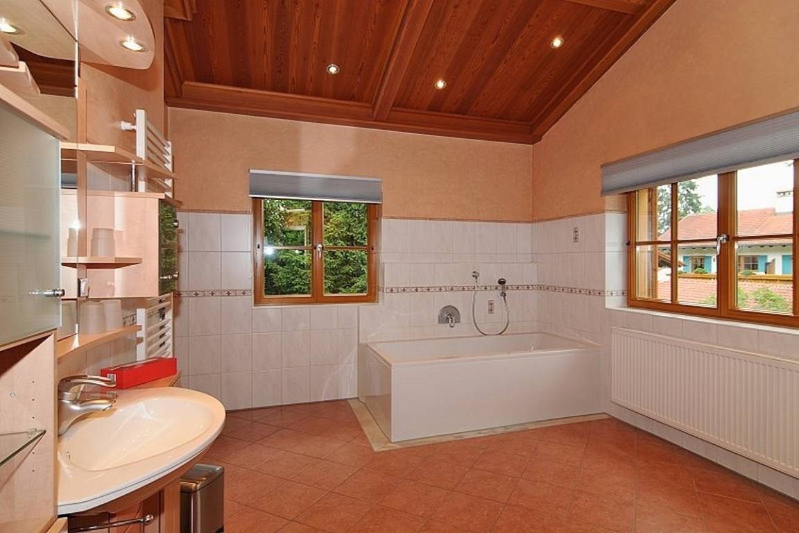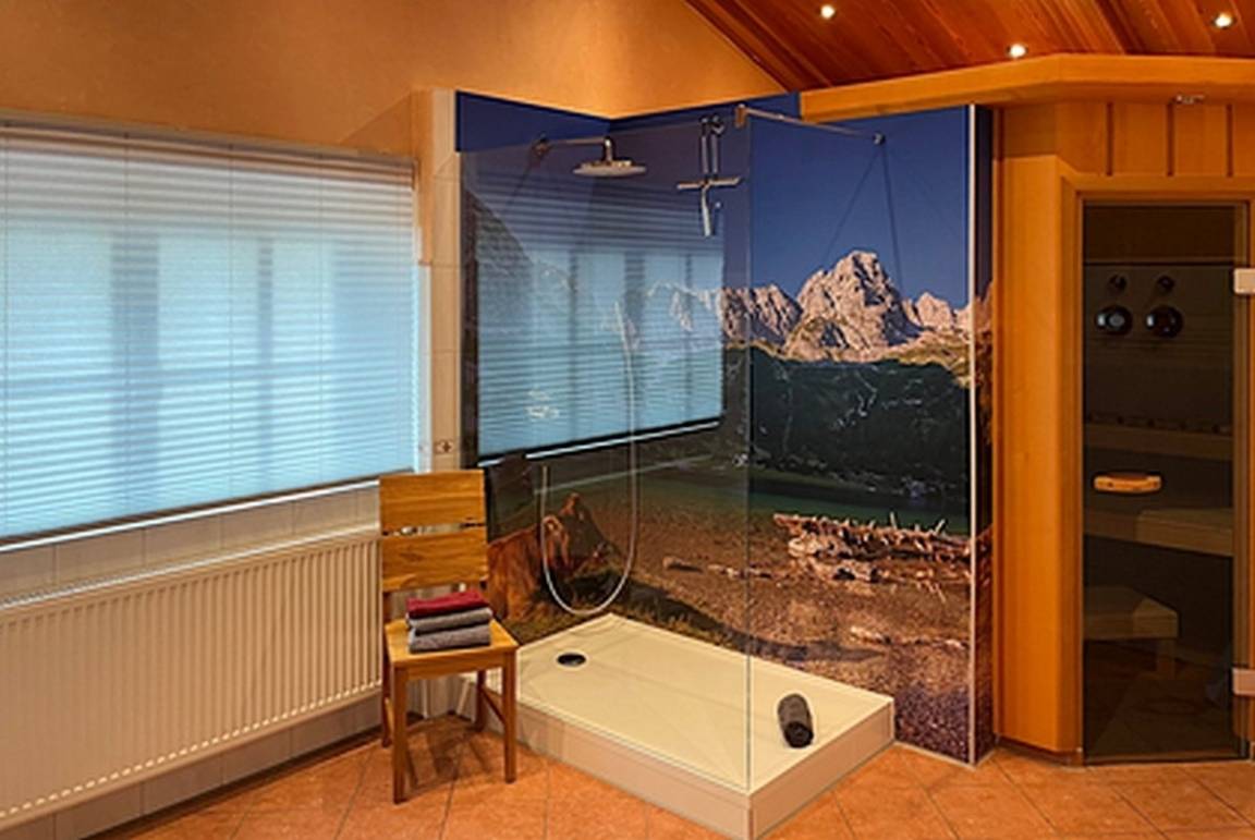 Das großzügige Badezimmer ist mit einem Whirlpool, einer Dusche mit Duschpaneel, einer Sauna mit Sanarium sowie einem WC ausgestattet. Zusätzlich steht eine weitere, separate Dusche mit WC zur Verfügung.