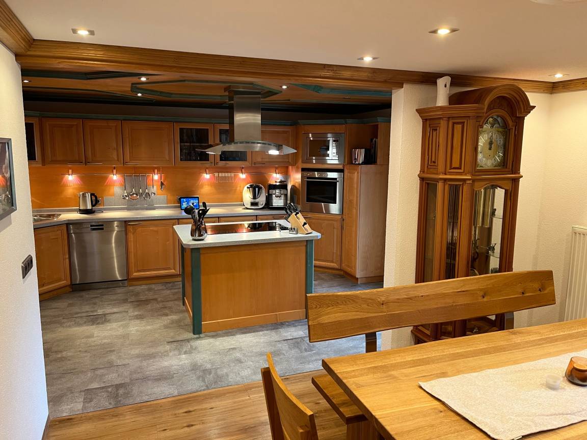 Die hochwertige Massivholzküche mit kompletter Ausstattung schließt direkt an das Esszimmer an und lädt zum gemeinsamen Kochen und Genießen ein.
