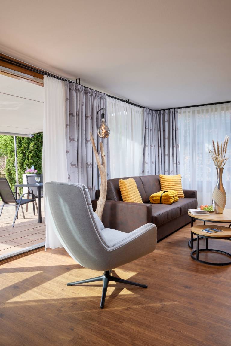 Unser wunderschönes Premium Maximilian Wintergarten Appartement mit ca 75m² bietet 2 separate Schlafzimmer, eine offene voll ausgestattete Wohnküche mit Panoramafenstern und ein modernes Bad mit Regendusche sowie ein extra Gäste WC. Von der großen Terrasse mit Sonnensegel genießen Sie den Bergblick und die Morgensonne mit direktem Gartenzugang. Die Ausstattung und Einrichtung im Alpin Chic lässt keine Wünsche offen.