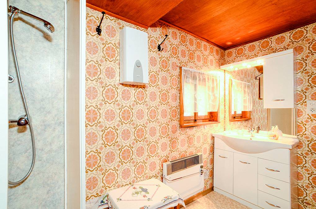 Haus: Gemütliches Ferienhaus mit funktionaler Einrichtung. Heizung durch Kaminofen, E-Radiatoren. Warmwasser über 100 l E-Boiler. Kostenloser Internetanschluss über W-Lan. Schöne, überdachte Terrasse mit Sitzmöbeln, kleiner Garten. Parkplatz unter Carport am Haus.