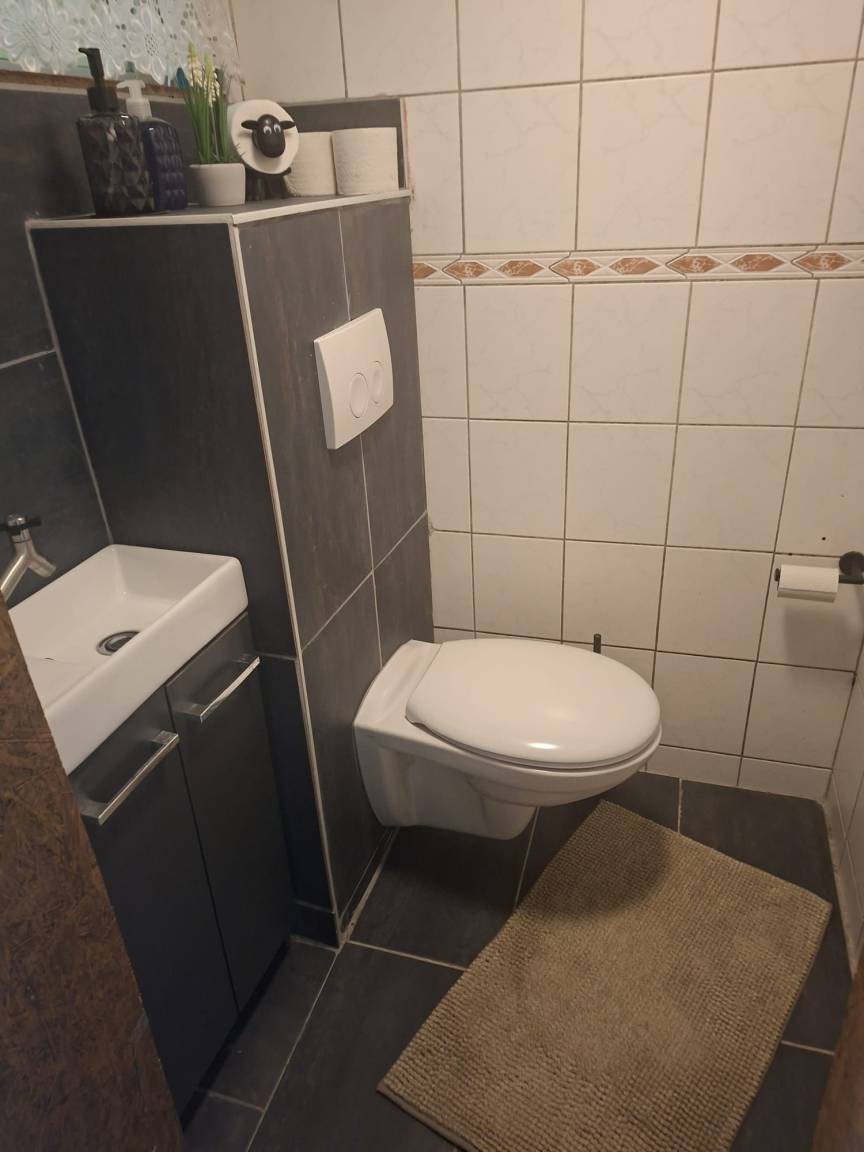 Bad mit Dusche und 2 separaten WCs. Eines davon im oberen Bereich mit Dusche und WC für das kleine Geschäft. Alles andere ungestört im WC im Souterrain des Hauses, welches über die Terrasse und Treppe hinunter erreichbar ist.