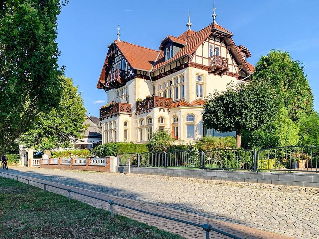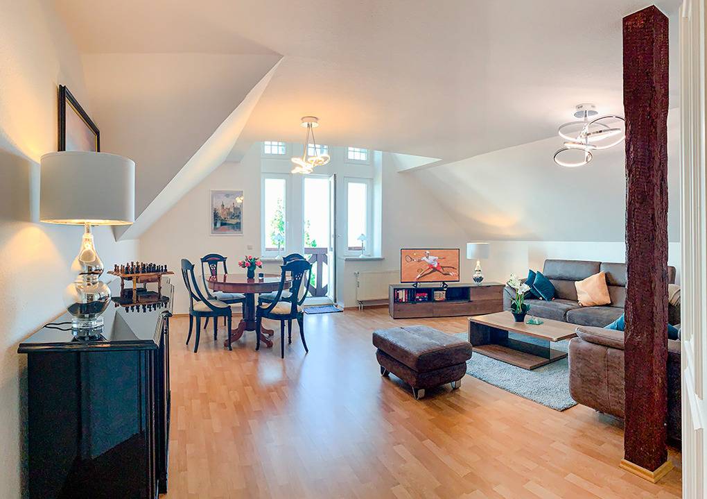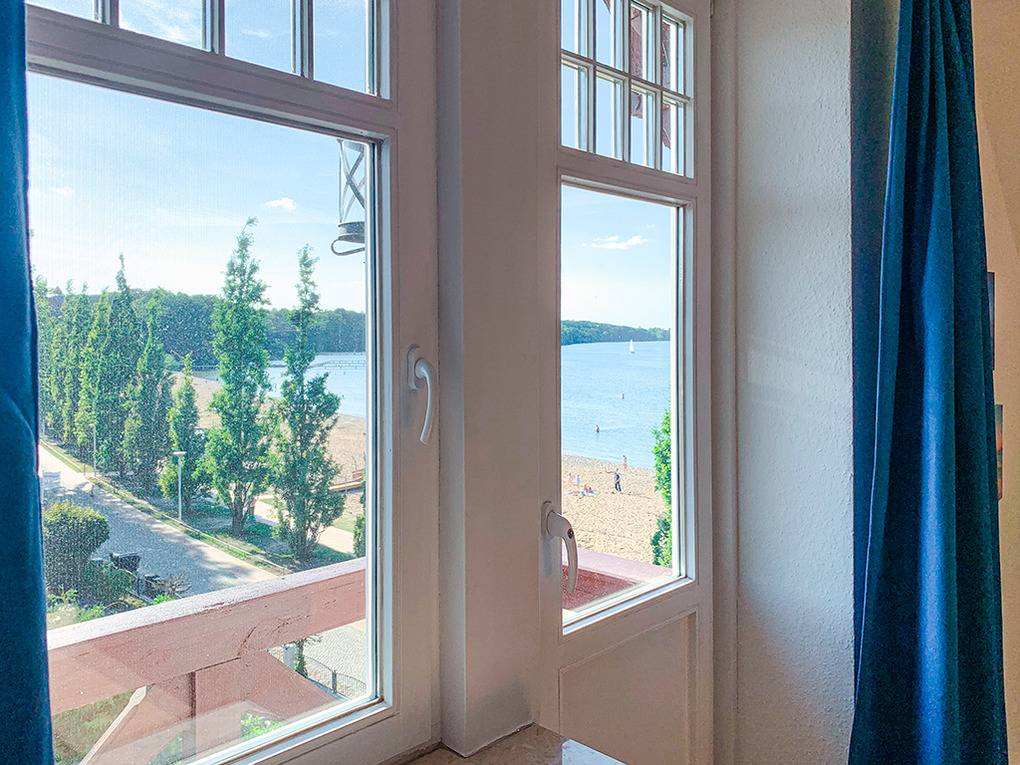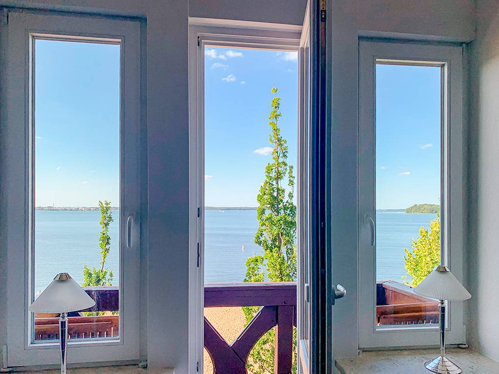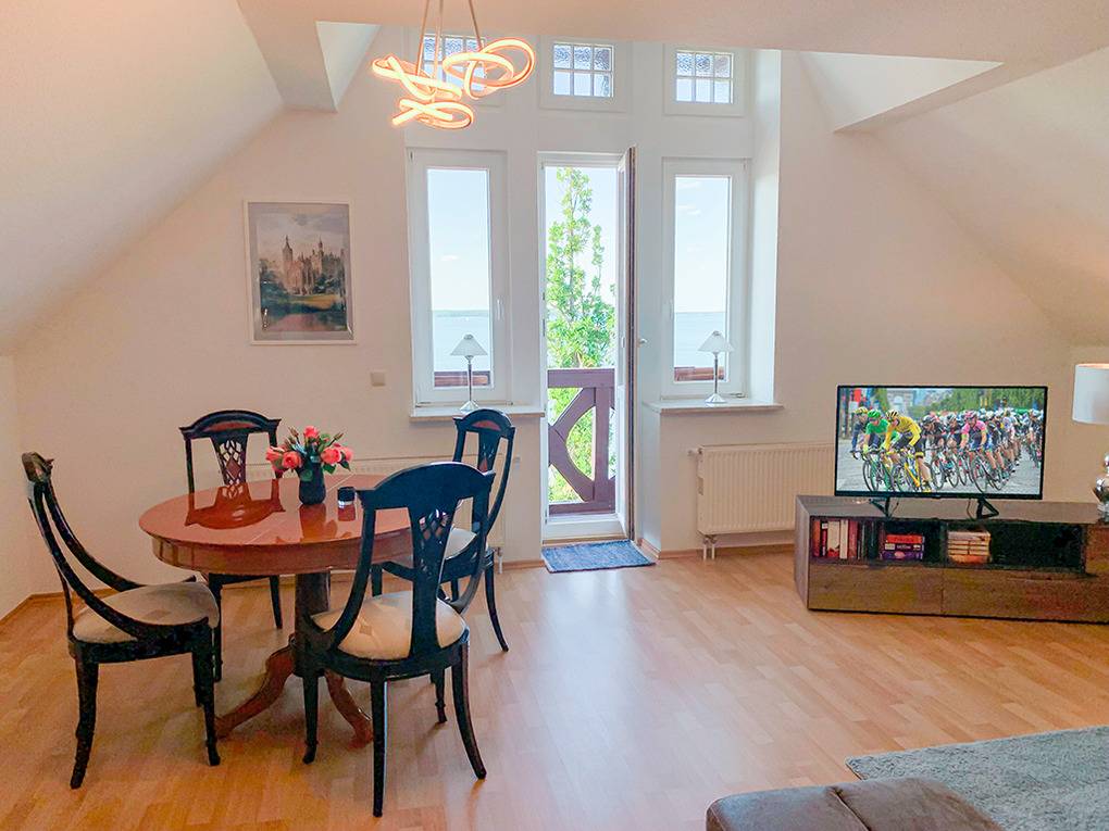 Haus: Denkmalgeschützte Villa von etwa 1900 mit drei Wohnungen. Hervorragende Lage in erster Reihe am Schweriner See. Die großzügige Ferienwohnung liegt in der 2. Etage und wurde 2021 aufwendig renoviert. Geschmackvolle, hochwertige Einrichtung. Internet über W-Lan. Gas-Zentralheizung. 2 kleine Balkone. Nichtraucherhaus. Pkw-Stellplatz am Haus. 2 Fahrräder vorhanden (Gebühr).