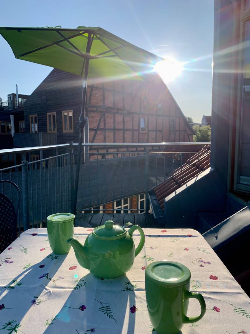 Unsere exklusive helle Maisonnette-Ferienwohnung für 2 - 1 Person befindet sich mitten im Herzen der Altstadt von Schwerin, im 3. Stock eines Mehrfamilienhauses direkt am Schweriner Ziegenmarkt. Das obige Bild zeigt den phantastischen Blick von Dachterrasse und Wohnküche. Die Wohnung ist hochwertig ausgestattet und verfügt über alle Annehmlichkeiten, die man für einen längeren Aufenthalt benötigt.
