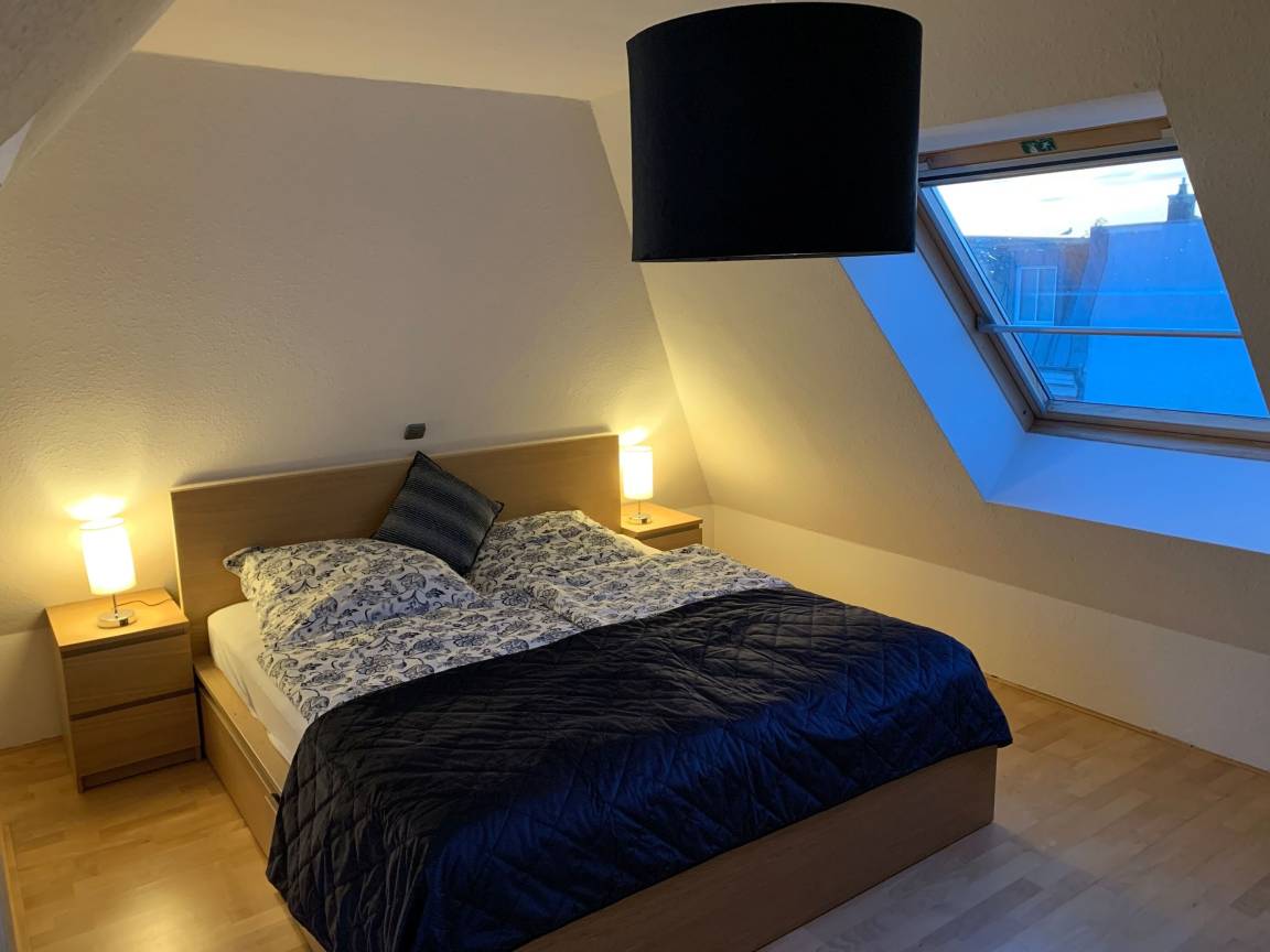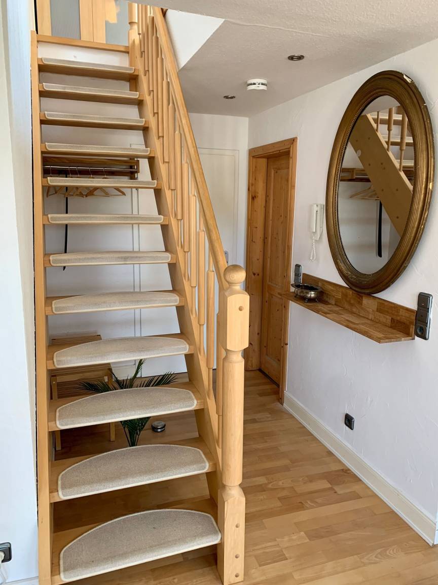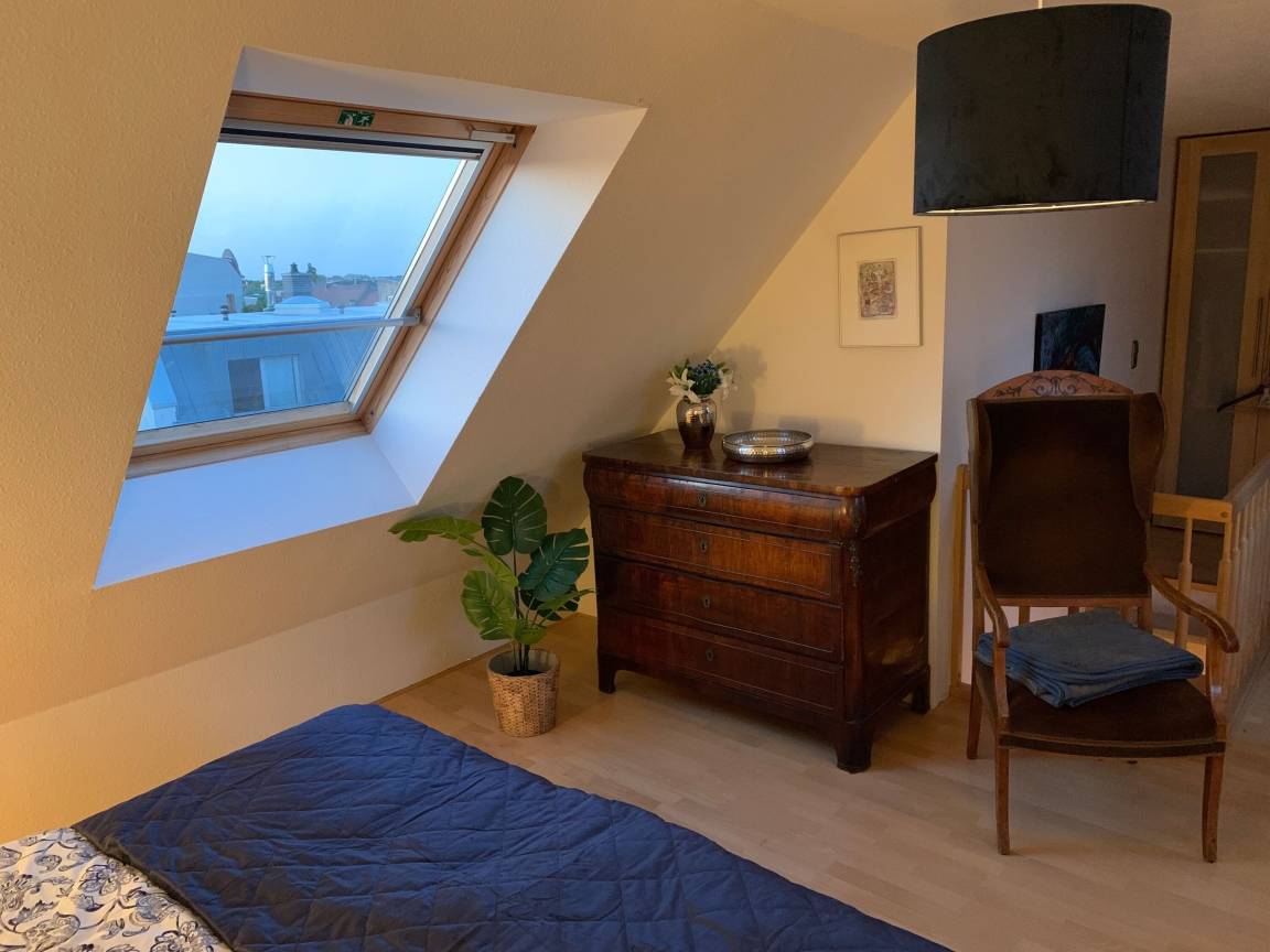 - über Treppe zugänglich Schlafzimmer im Maisonettestil großem Doppelbett (1,80 x 2,00m), Kommode