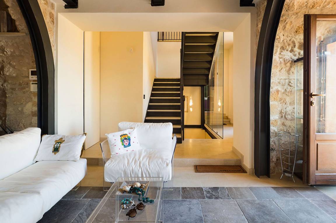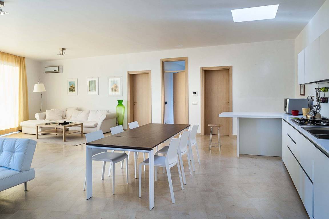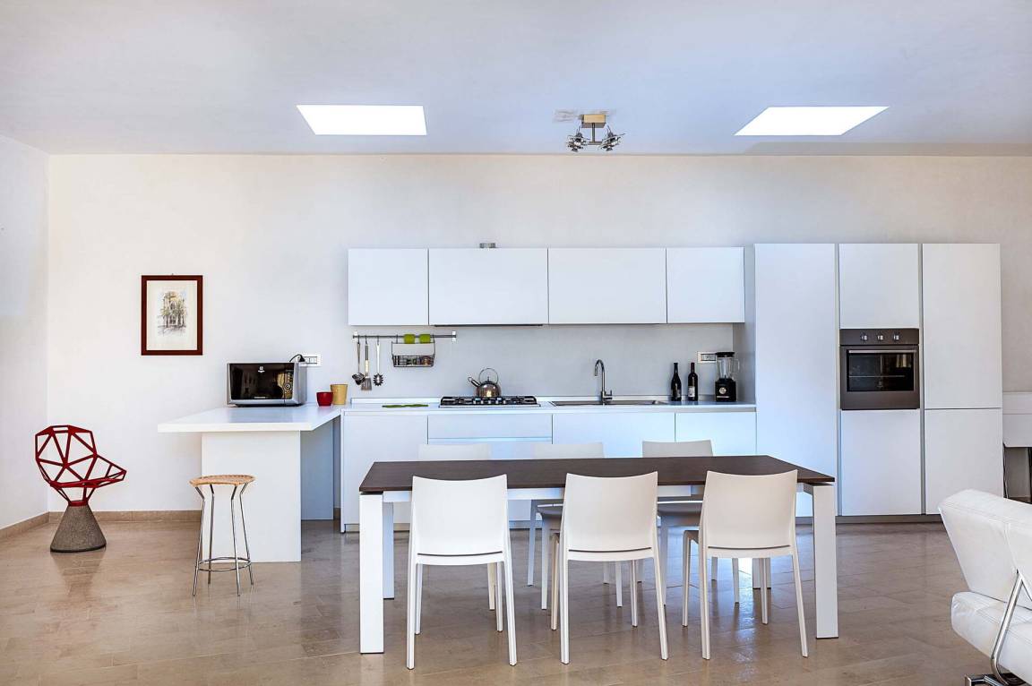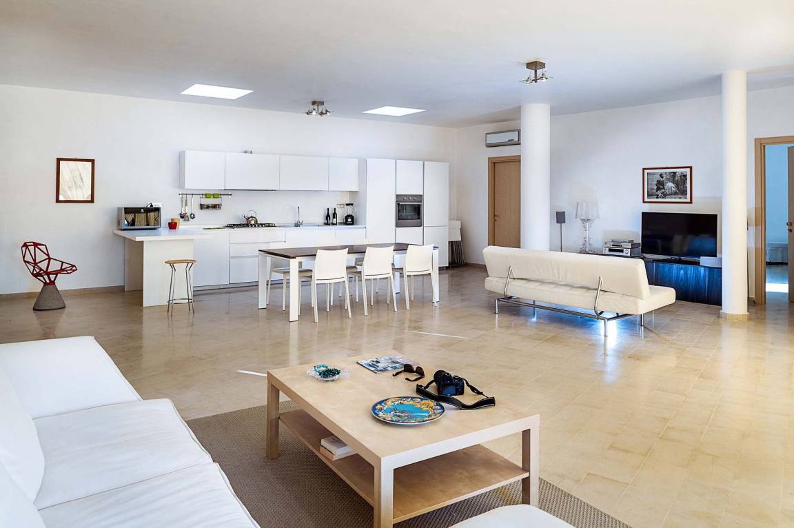 Wohnküche: gut ausgestattete Küche, Esstisch (Personen: 8), Spülmaschine, Kühlschrank, Tiefkühler, Mikrowelle, Herd, Ofen, Toaster, Italienische Kaffeemaschine, zwei Sofas (Personen: 8), vier Sessel, WiFi Internet, Internet, Klimaanlage, Kinderhochstuhl, Satelliten-TV, Rauchmelder, Ausgang auf die Terrasse.
