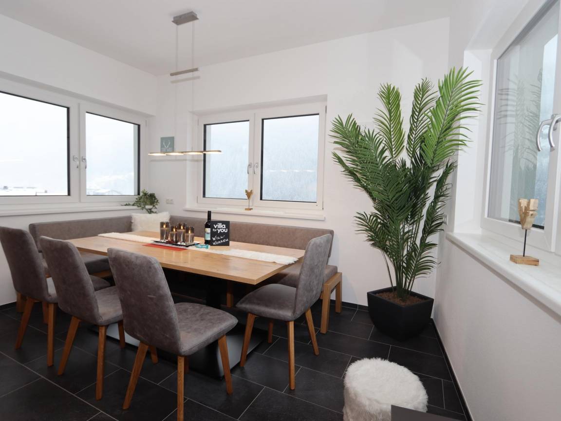 Layout : In der 1. Etage: Wohnzimmer mit TV(Flatscreen, Satellit), Esstisch, Sitzecke , offene Küche mit Wasserkocher, Kochherd(4 Kochplatten, Ceranfeld), Dunstabzugshaube, Kaffeemaschine, Backofen, Geschirrspüler, Kühl-/Gefrierkombination , Schlafzimmer mit Badezimmer mit Doppelbett, TV(Flatscreen, Satellit), Dusche, Waschbecken, Toilette , Schlafzimmer mit Badezimmer mit Doppelbett, Etagenbett, TV(Flatscreen, Satellit), Dusche, Waschbecken, Toilette , Flur, Skiabstellraum mit Skischuhheizung
