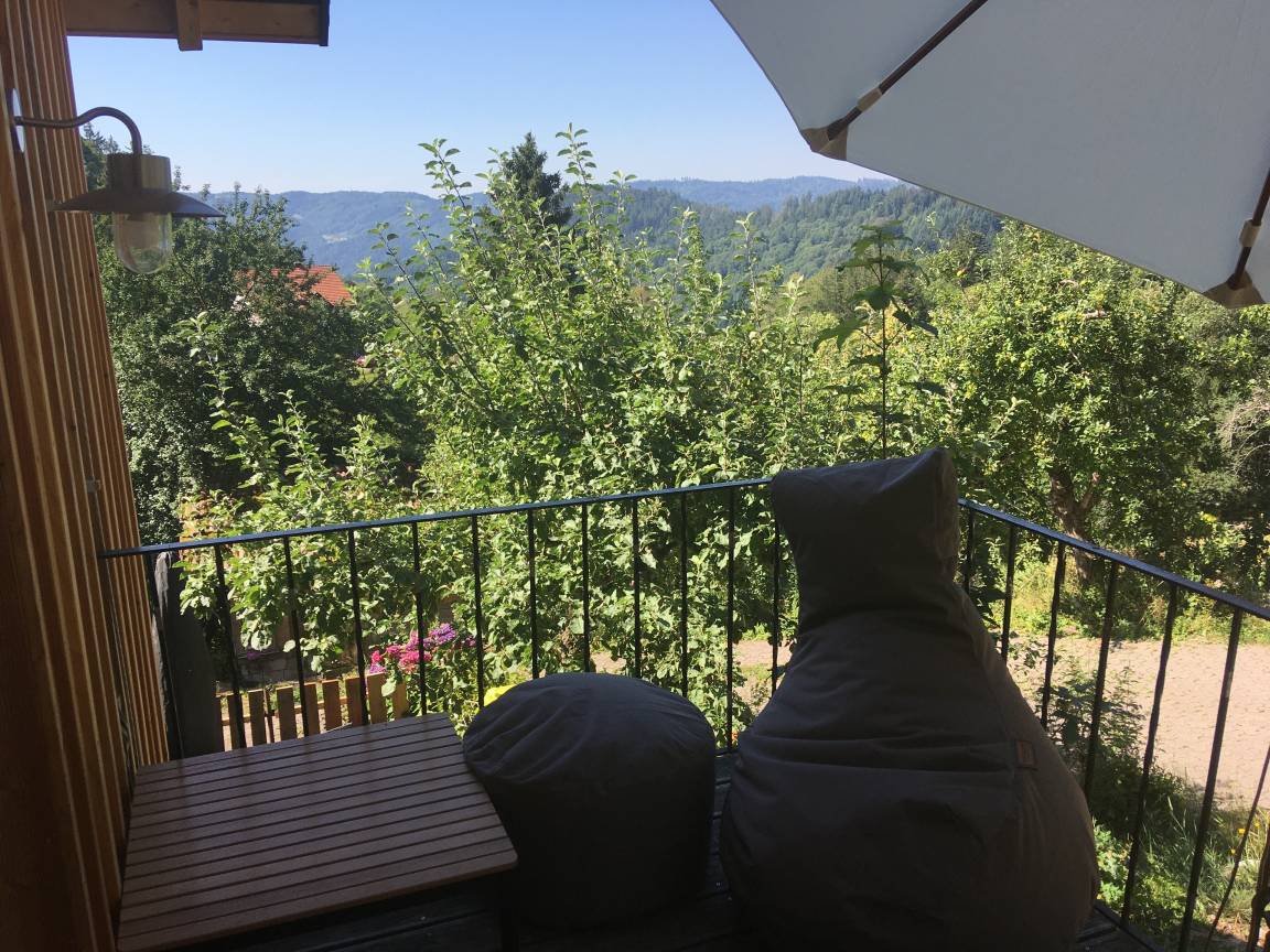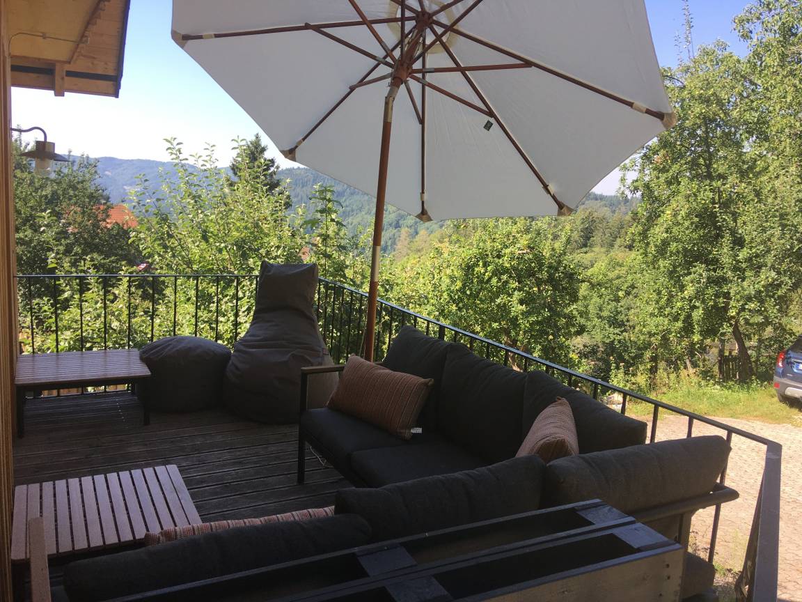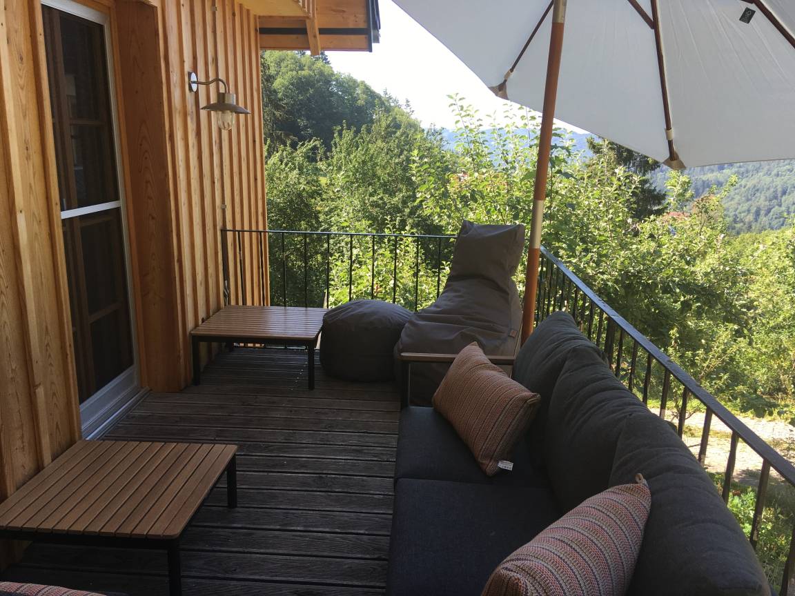 Der Balkon, wie auch die gemütliche Terrasse bieten einen schönen Ausblick ins Tal, wo man die Seele baumeln lassen kann. Auch in den Wintermonaten können Balkon und Terrasse mit unseren Regie-Stühlen anstatt der Loung genutzt werden.