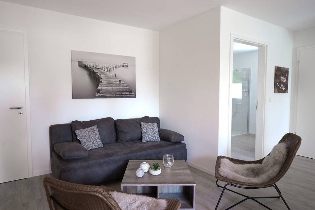 Ein Schlafzimmer mit einem 1.80 m breitem Doppelbett, eins mit zwei Einzelbetten, Wohnzimmer mit Ausziehcouch.
