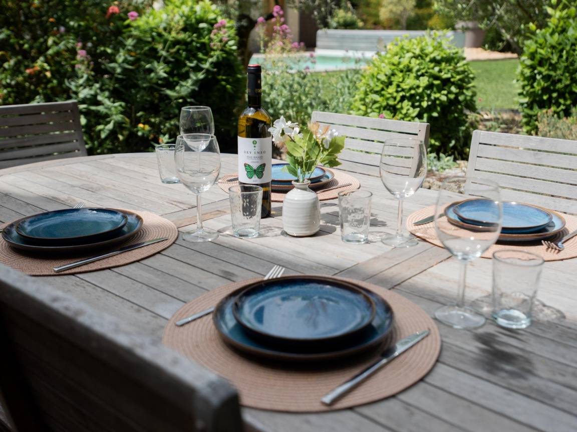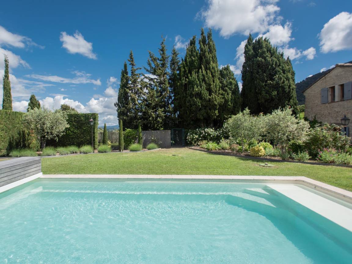Heizung, Innenhof(alleinige Nutzung), Terrasse(alleinige Nutzung), Garten(alleinige Nutzung, angelegt, illuminiert, umzäunt, 2700 m²), Gartenmöbel, Liegen, BBQ(Holzkohle), 3x Parkplatz, Pool(alleinige Nutzung, im Garten, Wasseralarm, 10 x 4 m., Tiefe: 1.3m, geöffnet von Mai bis einschließlich Sep), 1x Kinderbett (ohne Bettwäsche), 1x Hochstuhl, Föhn, Gartenlounge