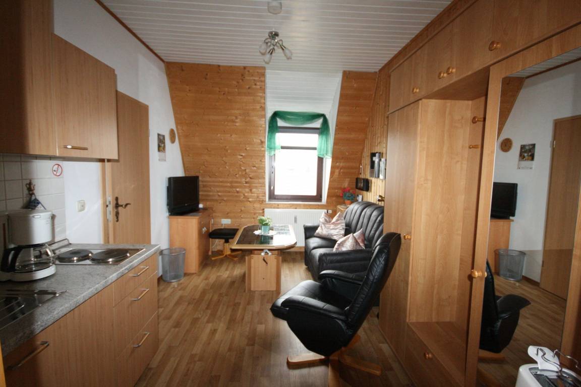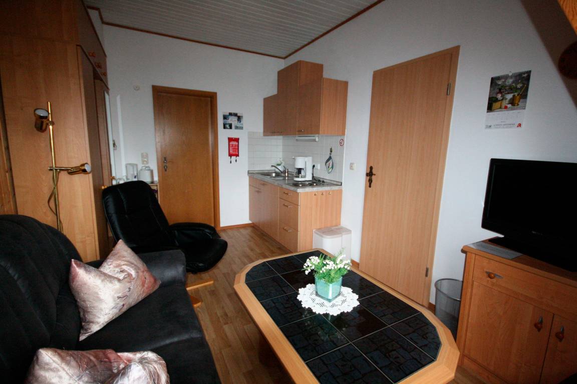 Unsere Kleine Ferienwohnung bietet Ihnen auf wenig Raum alles was man sich für einen Kurzurlaub wünscht. Die Wohnung hat ein Wohnzimmer mit Couch und Sessel, zur Unterhaltung stehen Ihnen Sat-TV, eine moderne Hifi Anlage mit CD Player, Radio und USB/SD Anschluss zur Verfügung. Ein kostenloser Internet Hotspot kann genutzt werden. Die Küchenzeile ist ausgestattet mit einer Doppelkochplatte, Kühlschrank mit Gefriermöglichkeit, Wasserkocher, Toaster und Kaffeemaschine.