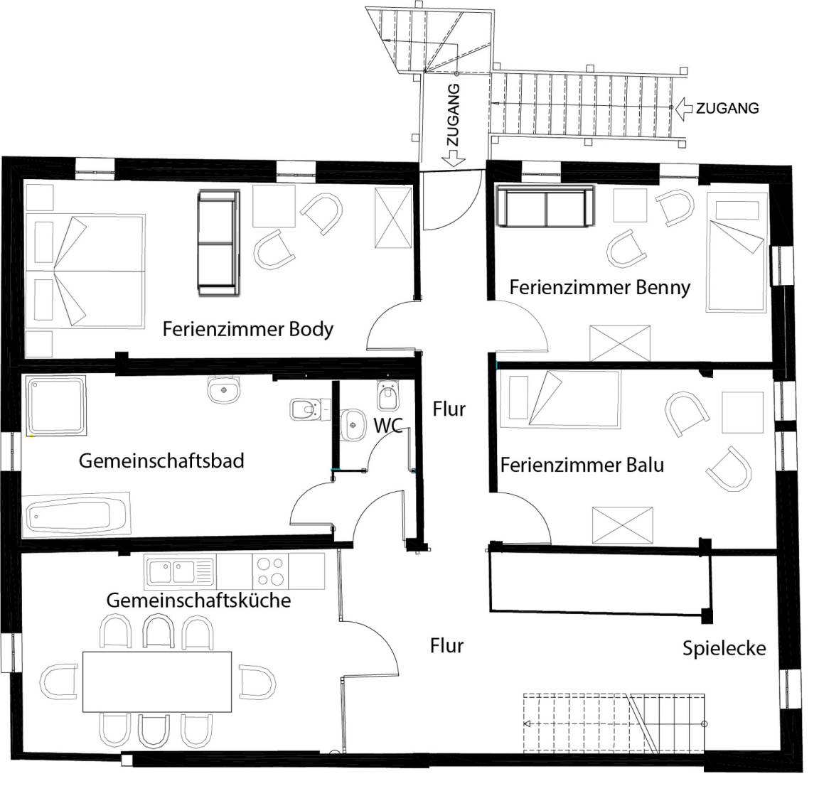 Mit 2 weiteren Ferienzimmern teilt sich dieses Zimmer ein Gemeinschaftsbad, sowie eine Gemeinschaftsküche.
