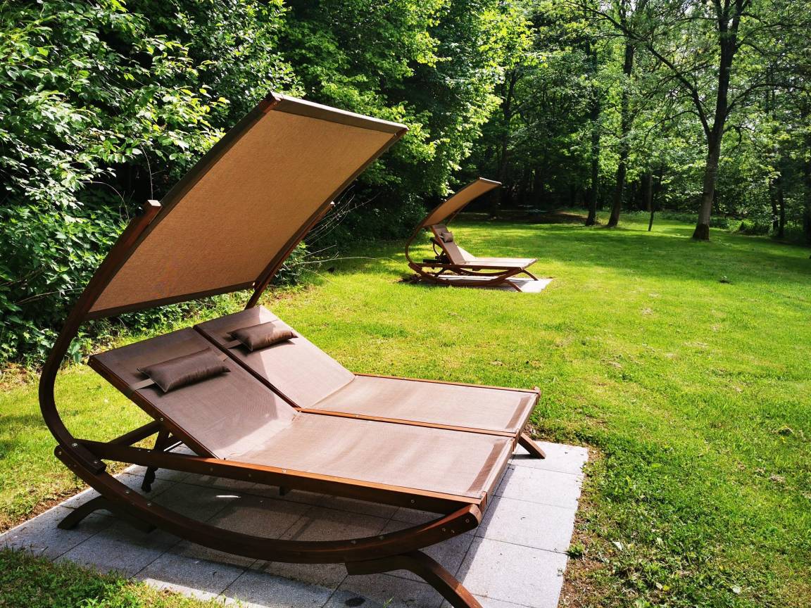 und Sonnenliege für die ganze Familie. Diverse Sonnenliegen. Wunderschöne Doppelsonnenliegen im hinterem Gartenbereich um die Ruhe und