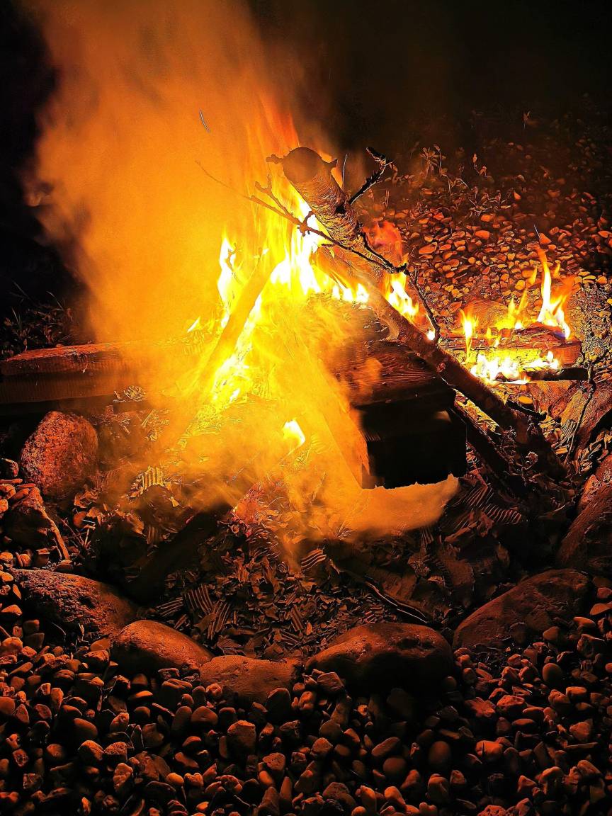 Eine stimmungsvolle Lagerfeuerstelle, eingebettet in die Natur mit Blick auf den idyllischen Gartenteich