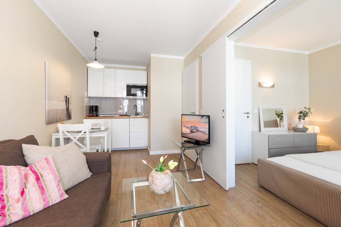 Die stilvoll eingerichtete Ferienwohnung „home sweet home" (Nr. 668) bietet auf 32 m² alles, was Sie für eine entspannte Auszeit zu zweit brauchen. Sie befindet sich im zweiten Obergeschoss eines gepflegten Hauses und überzeugt mit ihrer wohnlichen Atmosphäre und liebevollen Details.