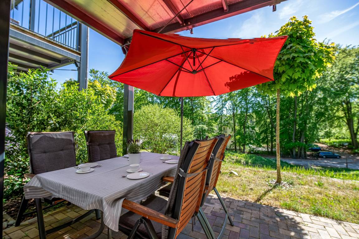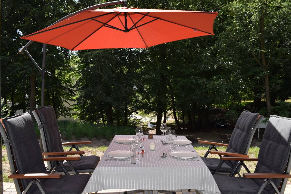 Die Terrasse ist mit einem Esstisch und vier verstellbaren Hochlehner-Stühlen und Sonnenschirm möbliert.