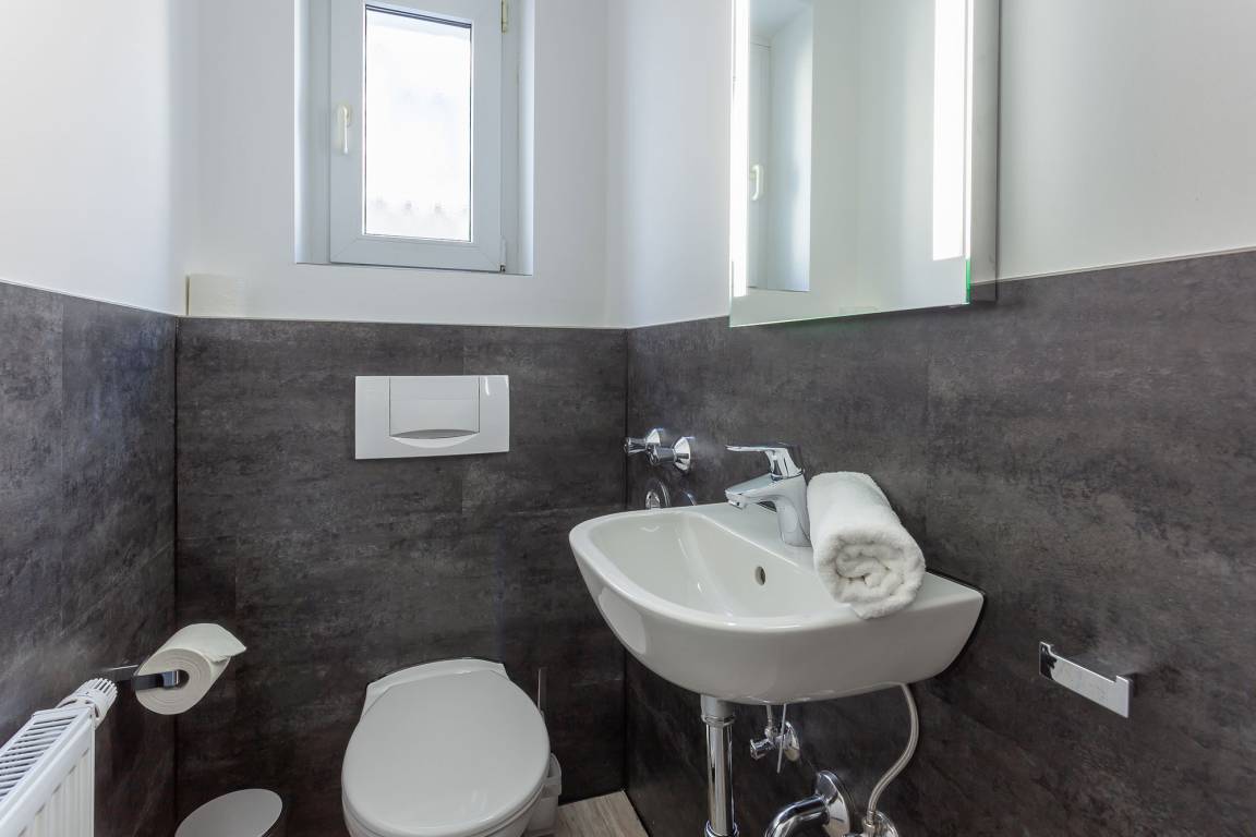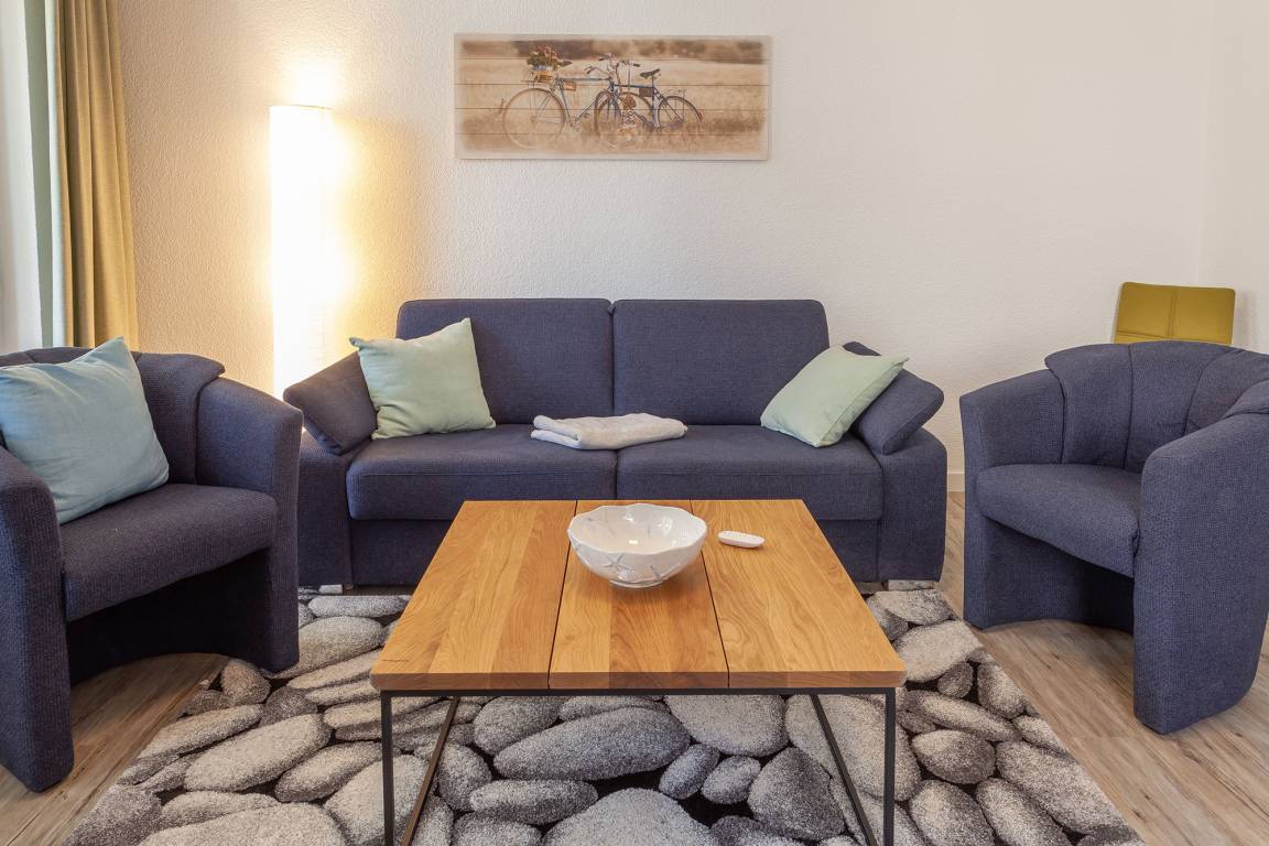 Zwei Schlafzimmer mit je einem Doppelbett und einem geräumigen Kleiderschrank bieten Platz für 4 Personen. Eine Aufbettung zur 5. und 6. Person ist auf der ausziehbaren Schlafcouch im Wohnzimmer möglich. Das Badezimmer überzeugt mit einem geräumigen Duschbad und einem separaten WC mit Handwaschbecken.