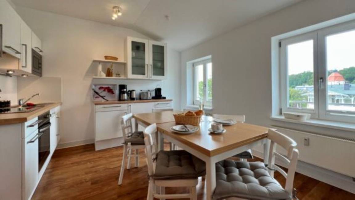 Die moderne Küche ist mit allem ausgestattet, was es für einen kulinarischen Kochabend benötigt: ein Ceranfeld, ein Backofen inkl. Abzugshaube, Mikrowelle, Geschirrspülmaschine und allerlei Küchenkleingeräte (Wasserkocher, Kaffeemaschine...). Besteck, Geschirr und andere Küchenutensilien sind selbstverständlich ebenso vorhanden. Direkt anschließend finden Sie im hellen Essbereich die Möglichkeit, bei einem gemütlichen Abendessen den Urlaubstag ausklingen zu lassen.
