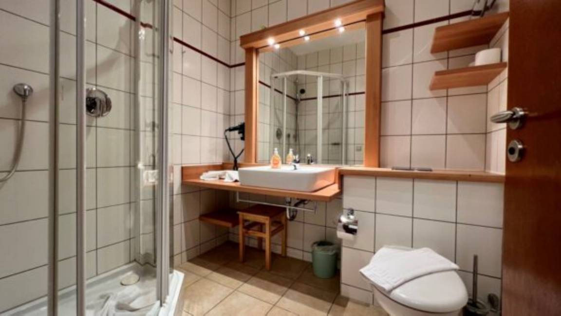 Die beiden Bäder bieten Ihnen jeweils eine Dusche, ein WC und einen Waschtisch mit Waschbecken und Spiegel.