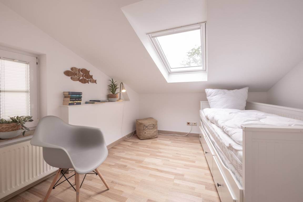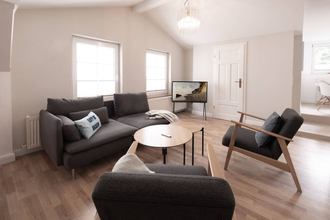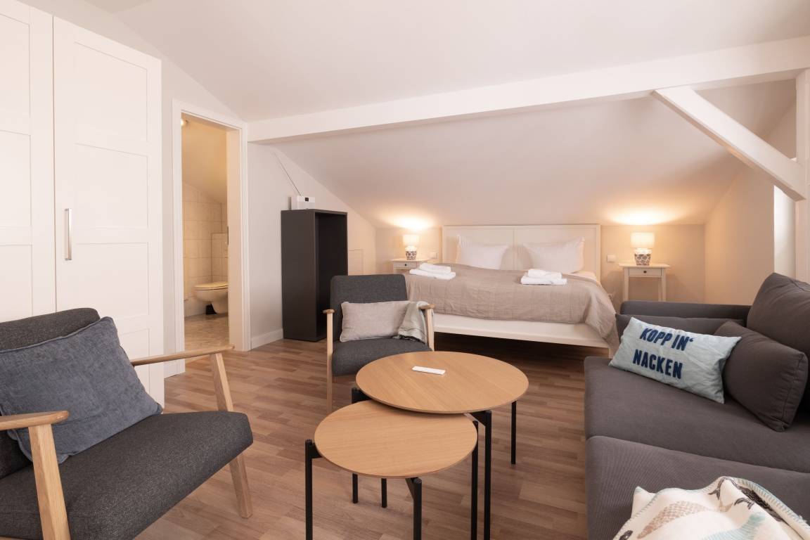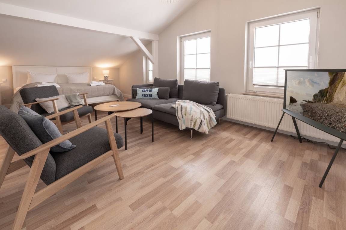 Die Ferienwohnung Wind [&] Wolke ist eine schnuckelige 2-Zimmer-Wohnung im Obergeschoss der Villa Granitz. Hell und freundlich wirkt sie und gefällt gleichwohl mit ihren romantischen Dachschrägen und dem sorgsam ausgesuchten Interieur. Alles wurde so arrangiert, dass auf den 50 Quadratmetern Wohnfläche ein hübsches Urlaubsdomizil mit genügend Platz für bis zu vier Personen entstanden ist. Im kombinierten Wohn- und Schlafraum laden bequeme Polstermöbel zum Relaxen ein. Im hinteren Bereich wartet ein großes Doppelbett auf Sie. Zwei weitere Betten befinden sich im separaten Schlafzimmer.