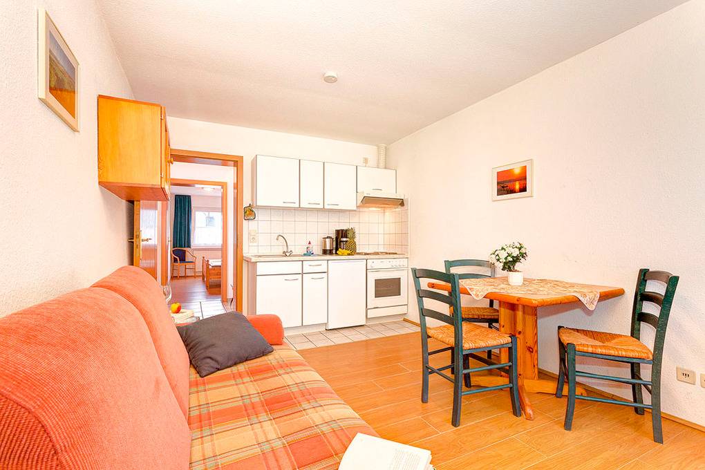 D 91.20 Wohnung 2-4 Pers.: 2-Zimmerwohnung, 39 qm Wohnfläche, Parterre. Wohn-/Essraum mit Couchgarnitur (Schlafcouch 2 Pers.), Esstisch, Küchenzeile. Doppelzimmer. Bad/WC. Schöne Terrasse mit Sitzmöbeln.