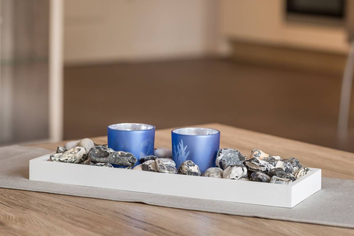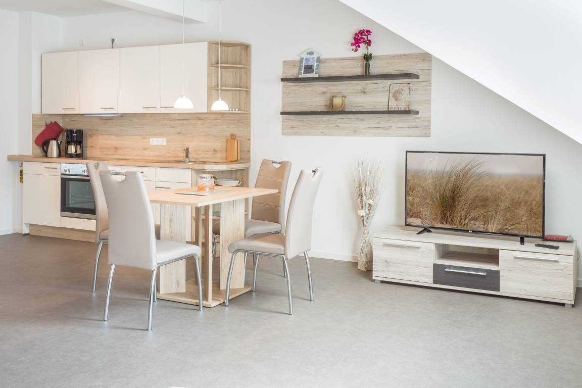 Betreten Sie den offenen, hellen Flurbereich und lassen Sie sich von der maritimen Heimatatmosphäre mitreißen. Der Wohnbereich lädt mit Hilfe der modernen, aber dennoch gemütlichen Couchgarnitur zum Verweilen ein. Hier ist auch eine Aufbettung für zwei weitere Personen möglich. Ein komfortabler Essbereich und ein Flachbild-TV runden das Gesamtbild gekonnt ab. Ein kostenfreier WLAN-Zugang steht für Sie bereit.