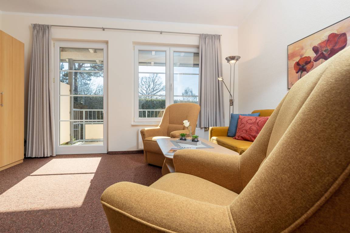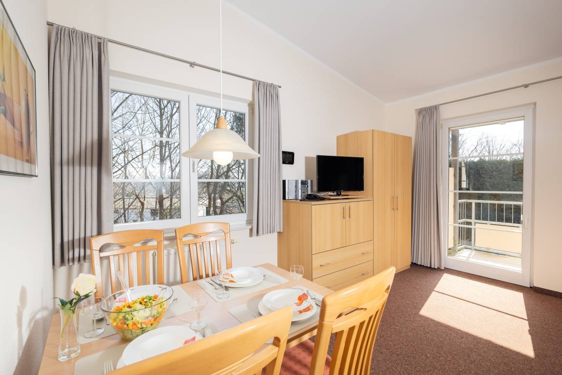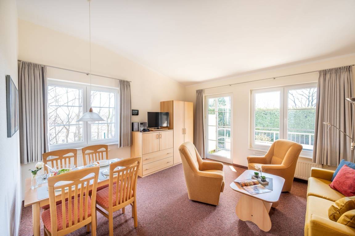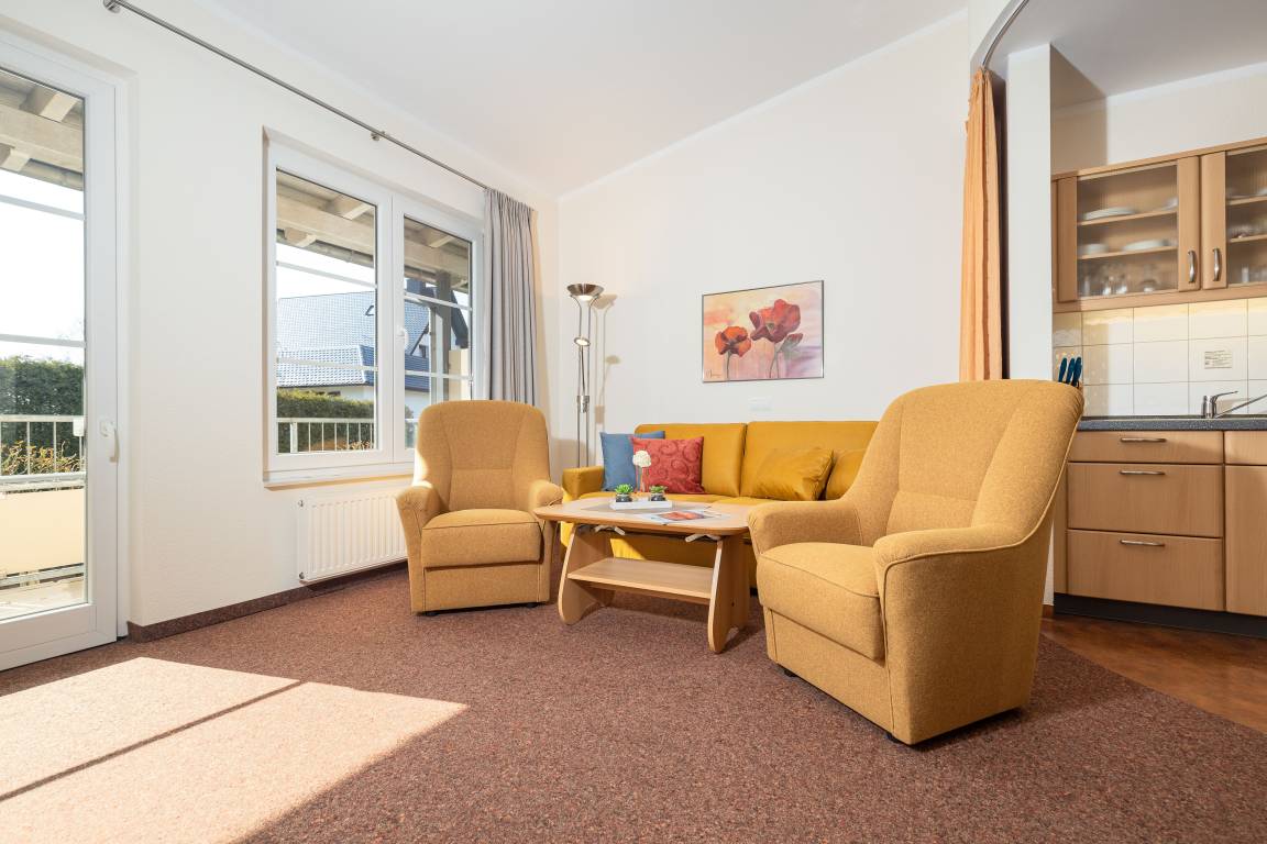 Das helle Wohnzimmer verfügt über eine Couchgarnitur, welche ebenso eine Aufbettung für 2 weitere Personen darstellt. Neben einem TV und einem kostenfreien WLAN-Zugang erreichen Sie von hier aus den sonnigen Balkon inkl. Balkonmöbel.