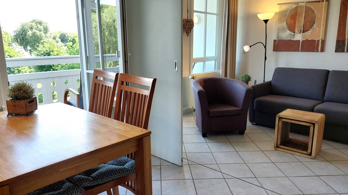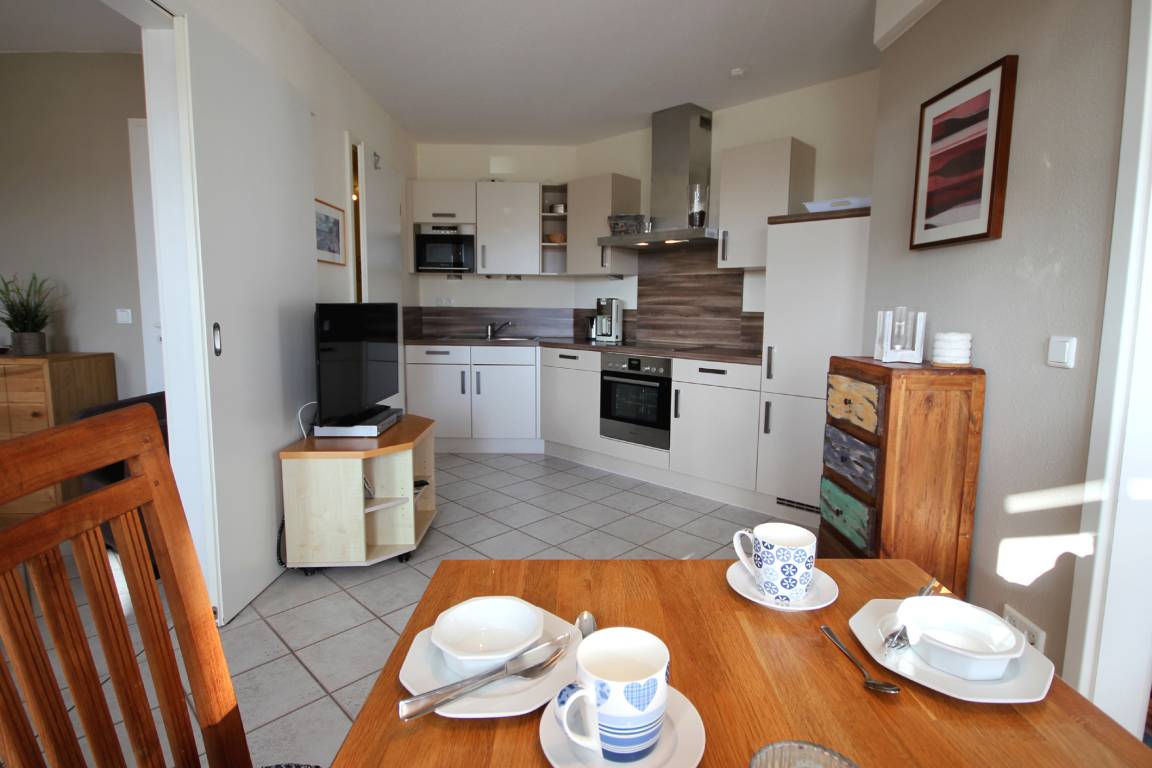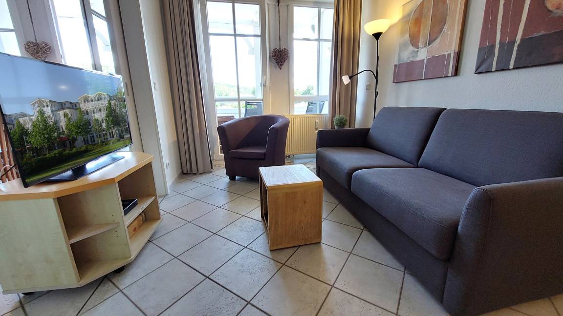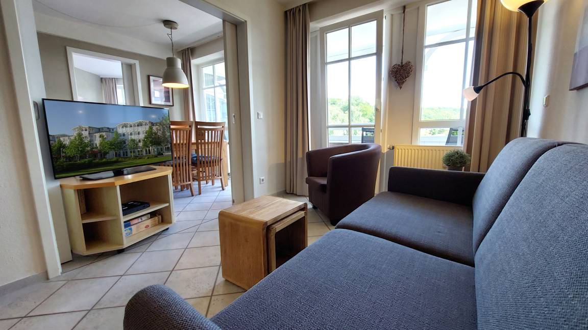 Ihre hochmodern ausgestattete 2-Zimmer Nichtraucher-Ferienwohnung 60RB644 befindet sich im Haus Mönchgut im Seepark Sellin. Sie ist ca. 52 qm groß und befindet sich im 2. Obergeschoss. Bis zu 4 Personen können sich gleich über zwei Balkone in süd-östlicher Richtung freuen. Im lichtdurchfluteten Wohnraum haben Sie neben dem gemütlichem Schlafsofa, welches Platz für die 3. u. 4. Person bietet, einen direkten Zugang zum Balkon. Der Flachbild-TV samt DVD-Player befindet sich auf einem Rollenregal, sodass er flexibel sowohl vom Wohn- als auch vom Essbereich nutzbar ist.