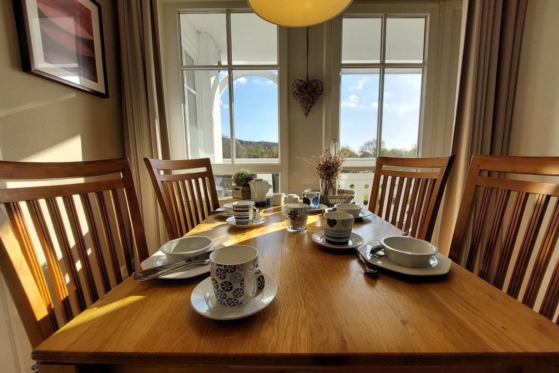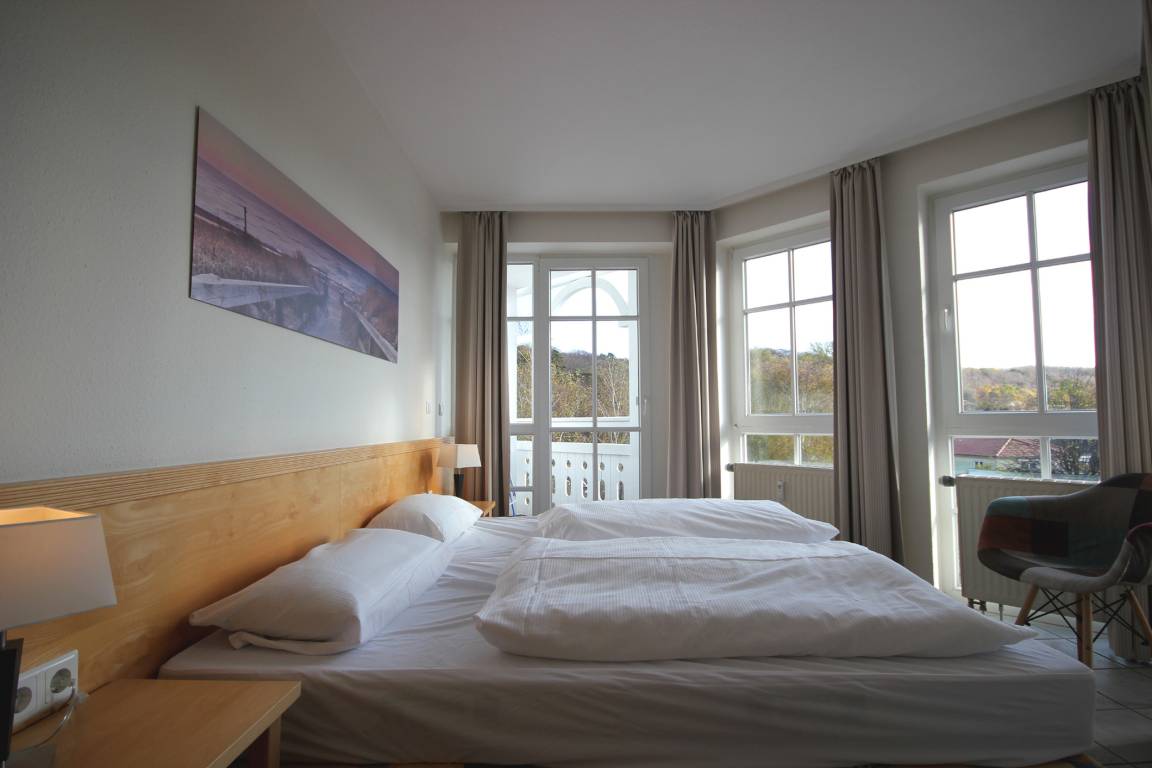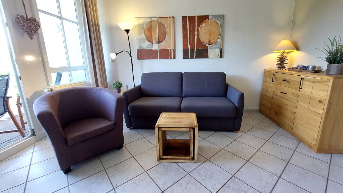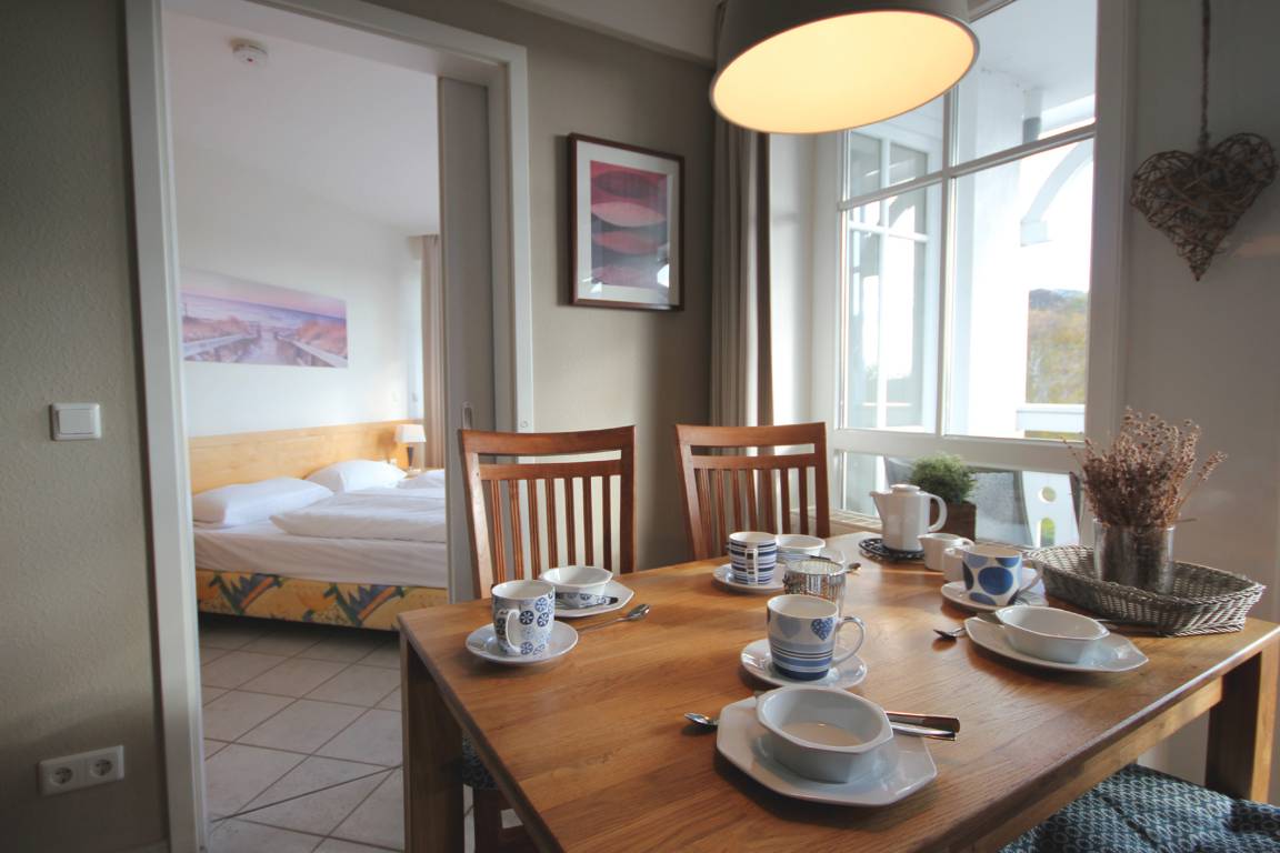 Ihre hochmodern ausgestattete 2-Zimmer Nichtraucher-Ferienwohnung 60RB644 befindet sich im Haus Mönchgut im Seepark Sellin. Sie ist ca. 52 qm groß und befindet sich im 2. Obergeschoss. Bis zu 4 Personen können sich gleich über zwei Balkone in süd-östlicher Richtung freuen. Im lichtdurchfluteten Wohnraum haben Sie neben dem gemütlichem Schlafsofa, welches Platz für die 3. u. 4. Person bietet, einen direkten Zugang zum Balkon. Der Flachbild-TV samt DVD-Player befindet sich auf einem Rollenregal, sodass er flexibel sowohl vom Wohn- als auch vom Essbereich nutzbar ist.
