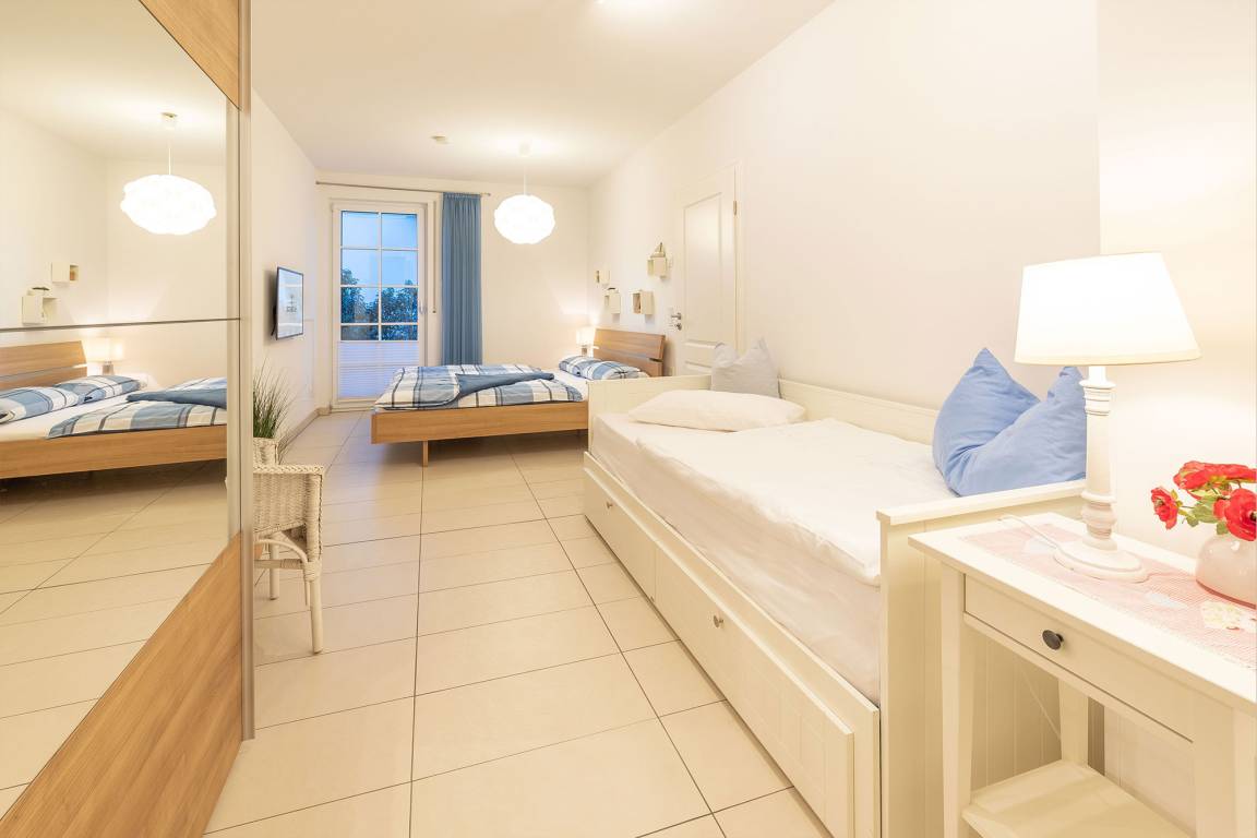 Das Schlafzimmer überzeugt mit einem komfortablen Doppelbett (180x200 cm), sowie einem zusätzlichen Einzelbett (Möglichkeit zur Aufbettung, ausziehbar auf 140x200 cm). Für einen erholsamen Schlaf und einen guten Start in den Tag, haben Sie die Möglichkeit durch Plissees und Rollladen das Zimmer zu verdunkeln.