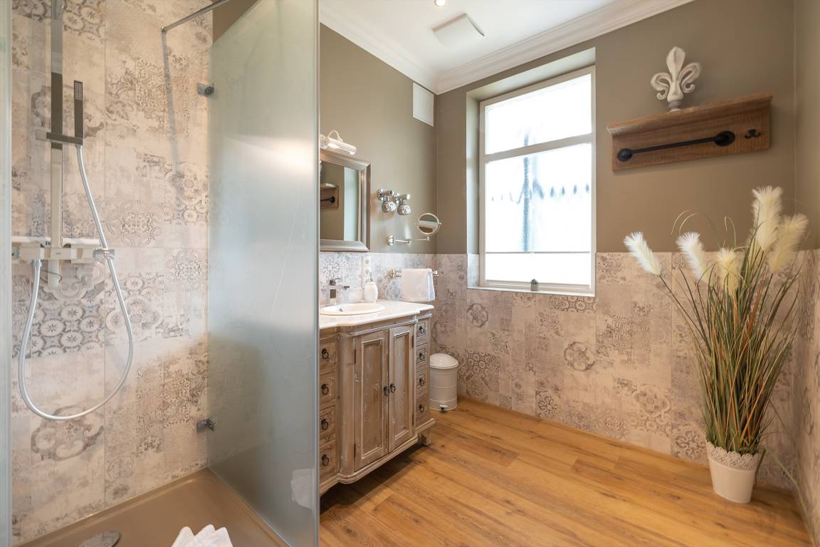 Als Rückzugsort erwartet Sie im Schlafzimmer ein Boxspringbett mit 180x200 cm und ein großer, geräumiger Kleiderschrank. Die Ferienwohnung verfügt über ein Bad mit Dusche, sowie einem separaten WC mit Handwaschbecken.