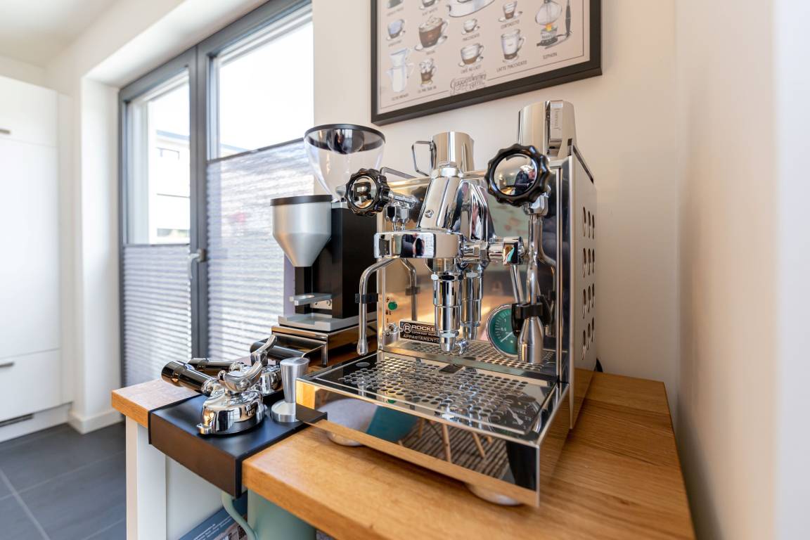 Außerdem stehen Ihnen in der Küche besondere Accessoires zur Verfügung. Seien es eine Moccamaster-Kaffeemaschine, ein Senseo-Automat oder eine Kaffeemahlmaschine, hier schmeckt das beliebte Heißgetränk in der wohnlichen Umgebung ausgezeichnet. Für Freunde der kulinarischen Unabhängigkeit befindet sich außerdem ein Backofen, ein 4 Felder Induktionskochfeld, zahlreiche Töpfe und Pfannen für gemütliche Kochabende in der schönen Küche.