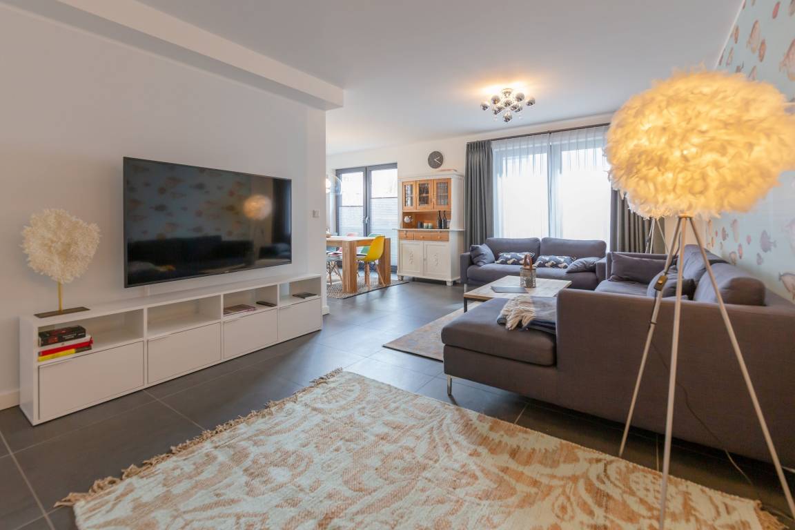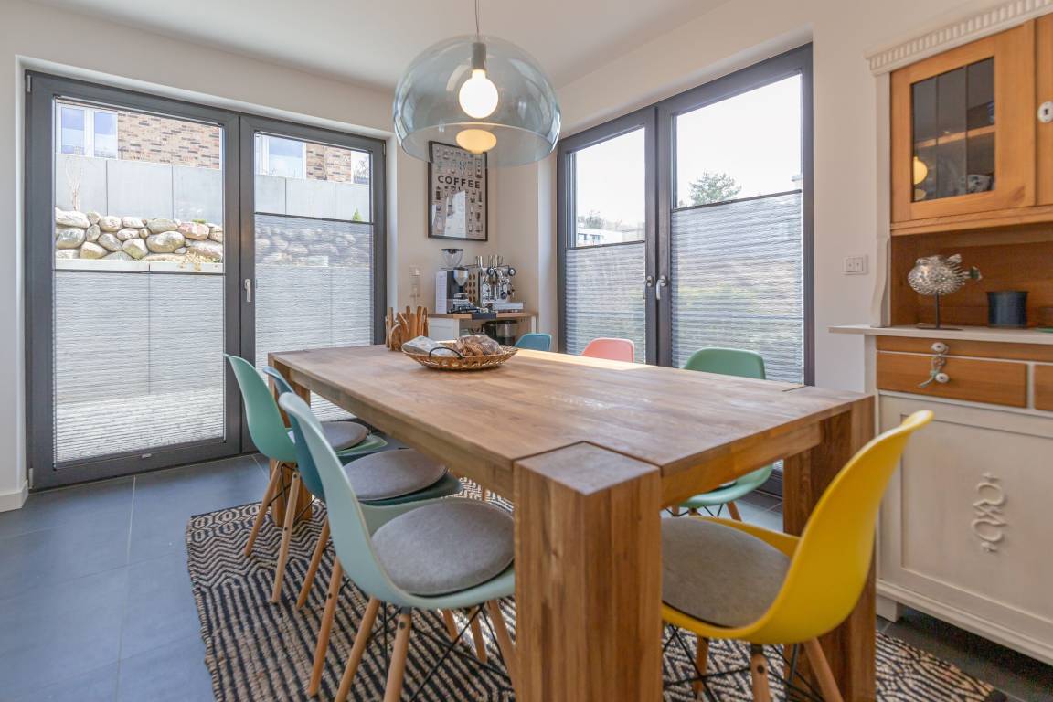 Der Wohnbereich ist mit einer komfortablen Eckcouch ausgestattet - lassen Sie hier die Seele baumeln! Weitere Sitzmöglichkeiten und einen Esstisch bietet der helle Essbereich an der offenen Küche. Hier ist genügend Platz für alle.