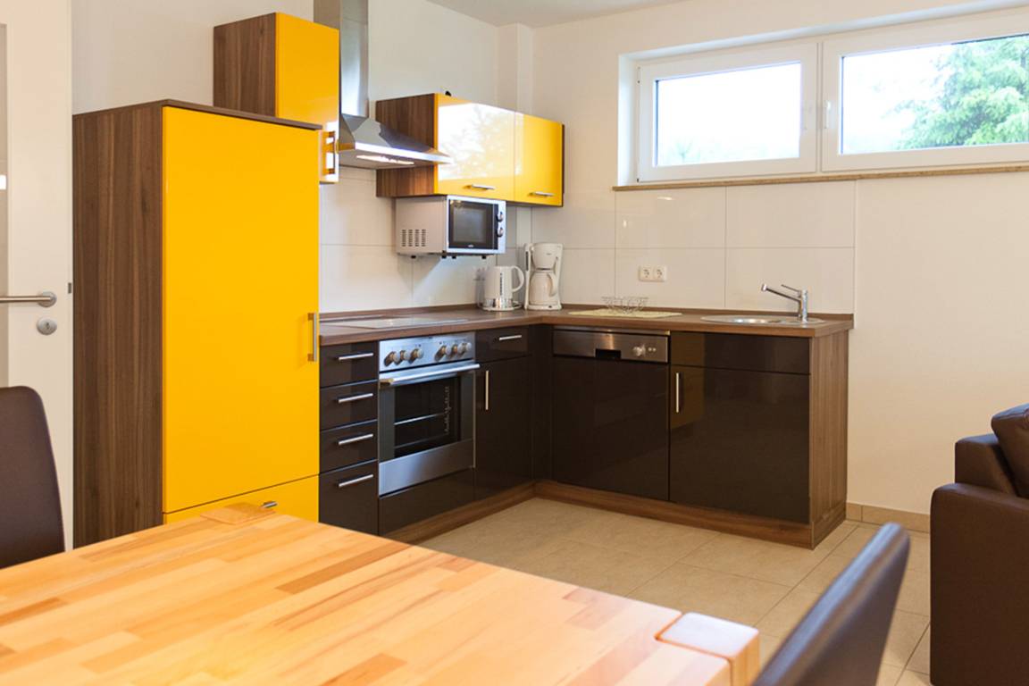 Den Mittelpunkt bildet der kombinierte Wohn- und Essbereich mit seinem großem Balkon und der offenen Küche. Ausgestattet mit Echtholzmöbeln und Polstermöbeln in passenden Naturtönen, Fußbodenheizung, LED-TV, DVD-Player, Mini-Stereoanlage und kostenfreiem W-LAN, können Sie es sich hier so richtig gut gehen lassen. Die hochwertige Küchenzeile verfügt u.a. über einen 4-Platten-Ceran-Herd, Backofen, Mikrowelle, Kühlschrank und Geschirrspülmaschine.