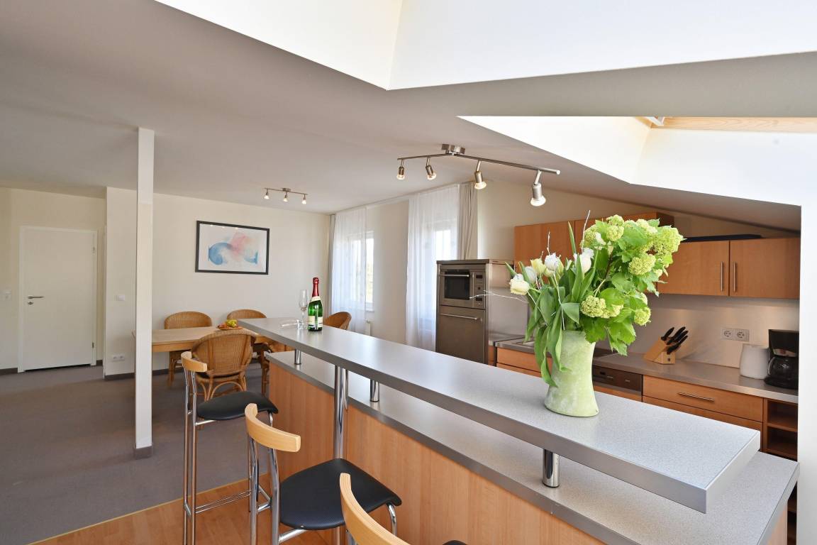Die schöne Vier-Zimmer Ferienwohnung Nr. 13 mit einer Größe von 132 m² für bis zu 8 Personen liegt im 3. Obergeschoss (Dachgeschoss) und hat die folgende Einrichtung / Ausstattung: