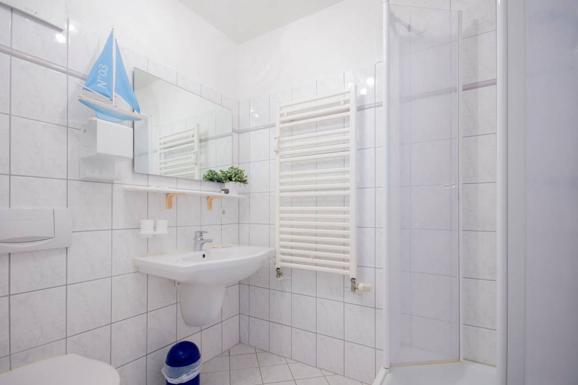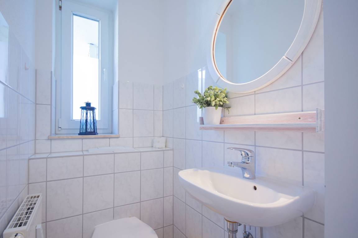 Das hell erleuchtete Badezimmer ist mit einer Dusche, einem Waschbecken mit großem Spiegel und einer Toilette ausgestattet. Zudem gibt es noch ein separates Gäste-WC mit Fenster.