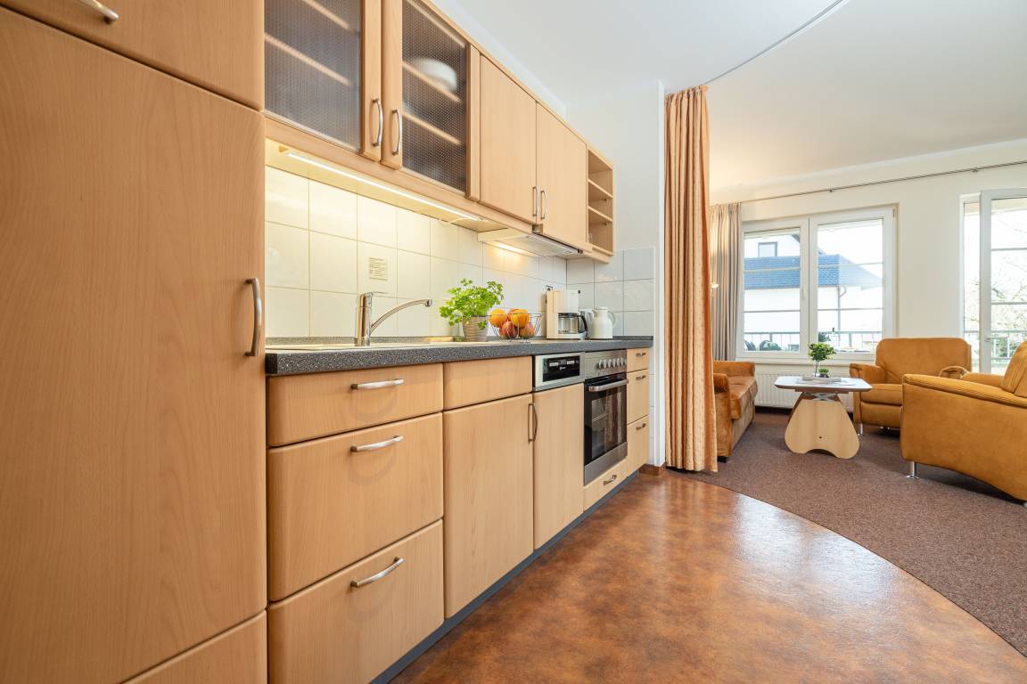 Die Küchenzeile ist mit einem Kühlschrank, einem Ceranfeld mit Backofen, einer Spülmaschine und einer Mikrowelle ausgestattet. Ebenso finden sich hier alle nötigen Küchenkleingeräte (Wasserkocher, Kaffeemaschine, Toaster..).