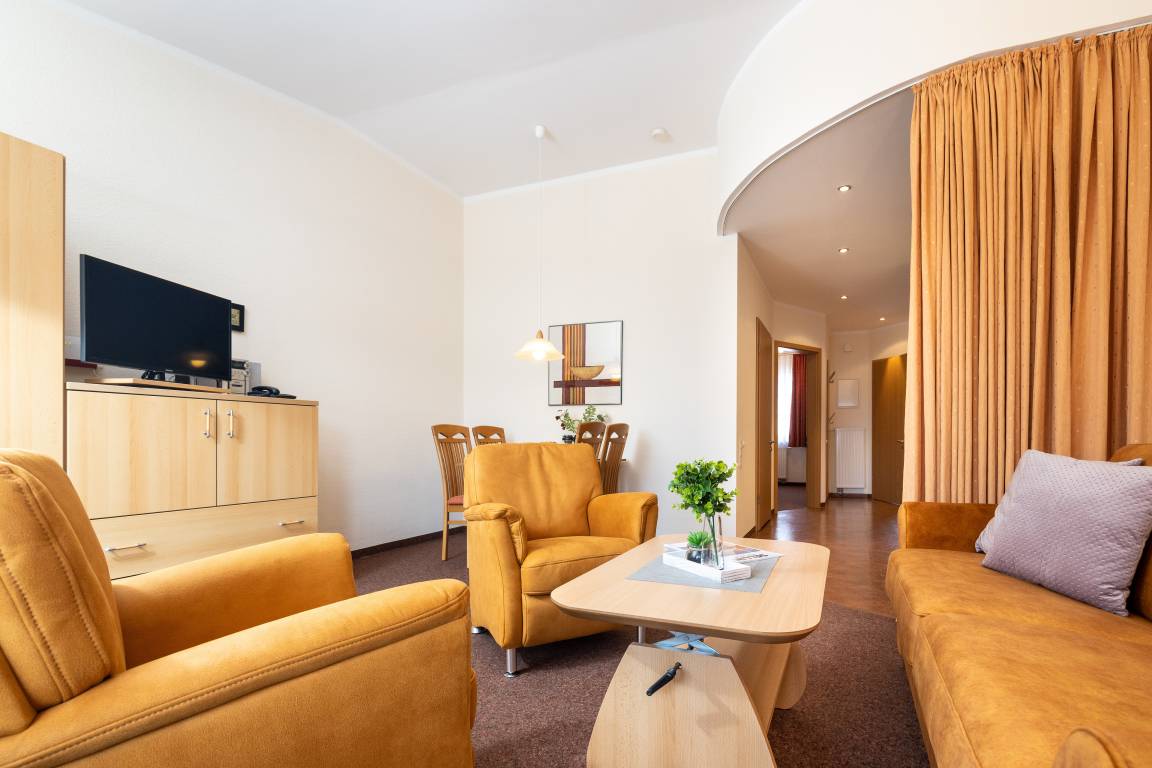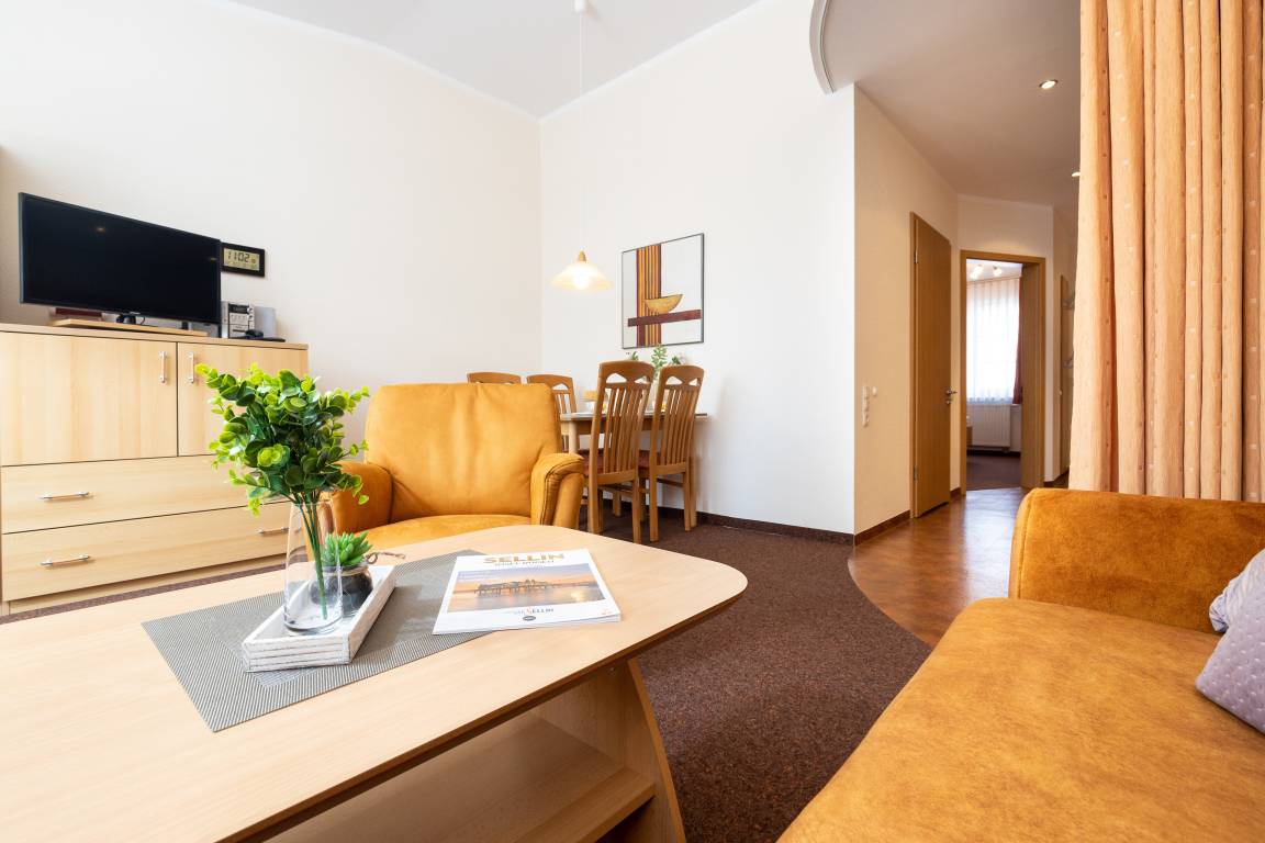 Das helle Wohnzimmer verfügt über eine Couchgarnitur, welche ebenso eine Aufbettung für 2 weitere Personen darstellt. Neben einem TV und einem kostenfreien WLAN-Zugang erreichen Sie von hier aus den sonnigen Balkon inkl. Balkonmöbel.