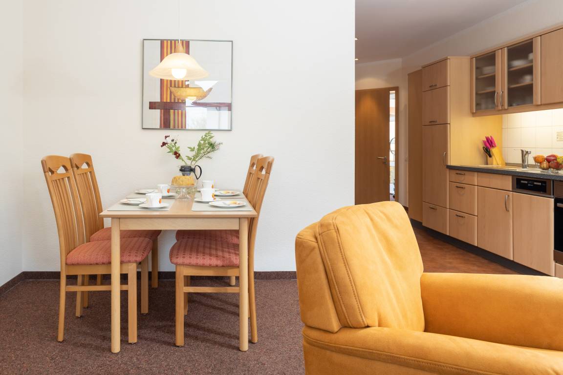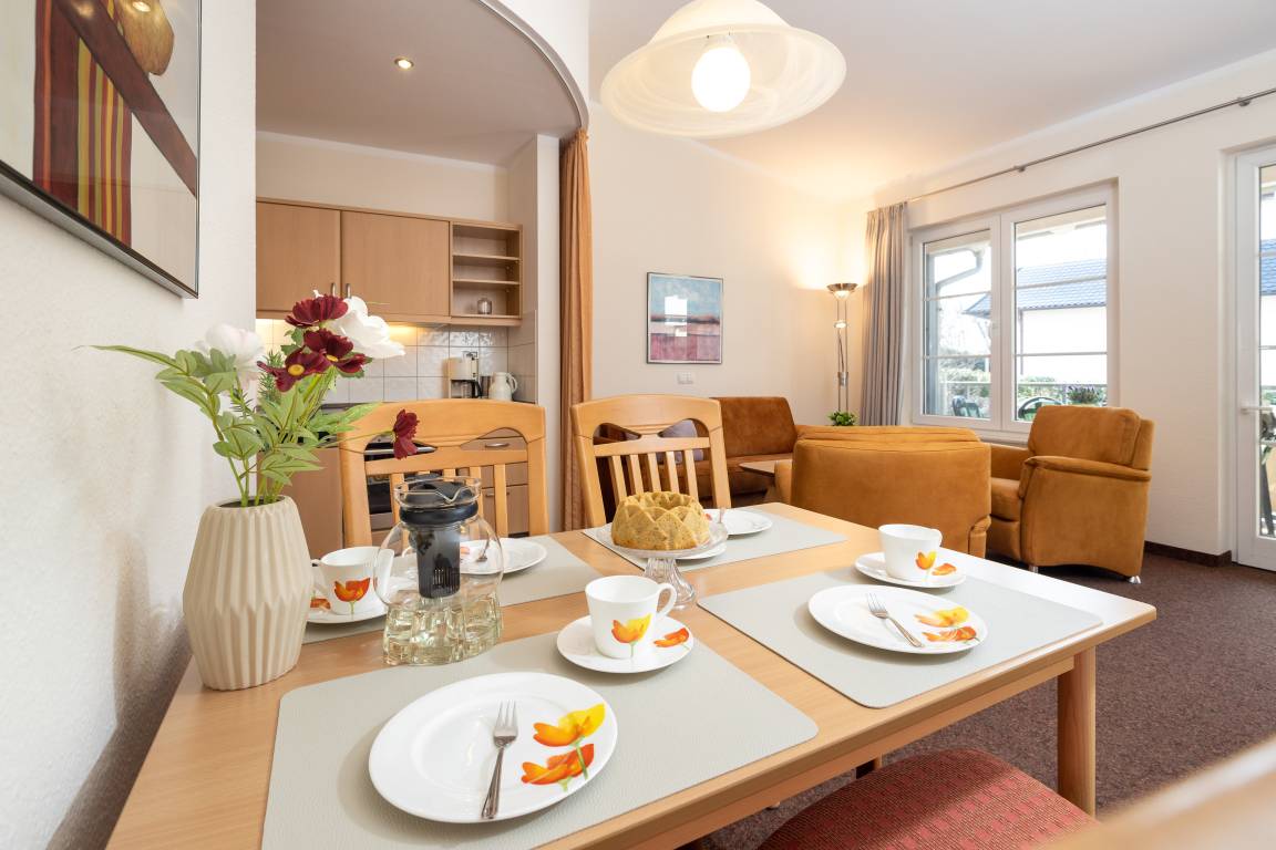Die freundlich eingerichtete Wohnung 14 in der Ferienanlage Margaretha ist ca. 58 m² groß und für bis zu 4 Personen ausgelegt.