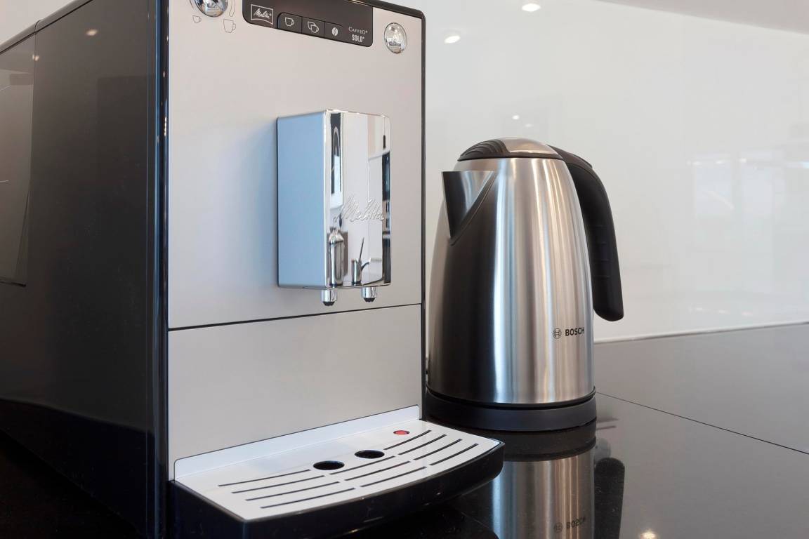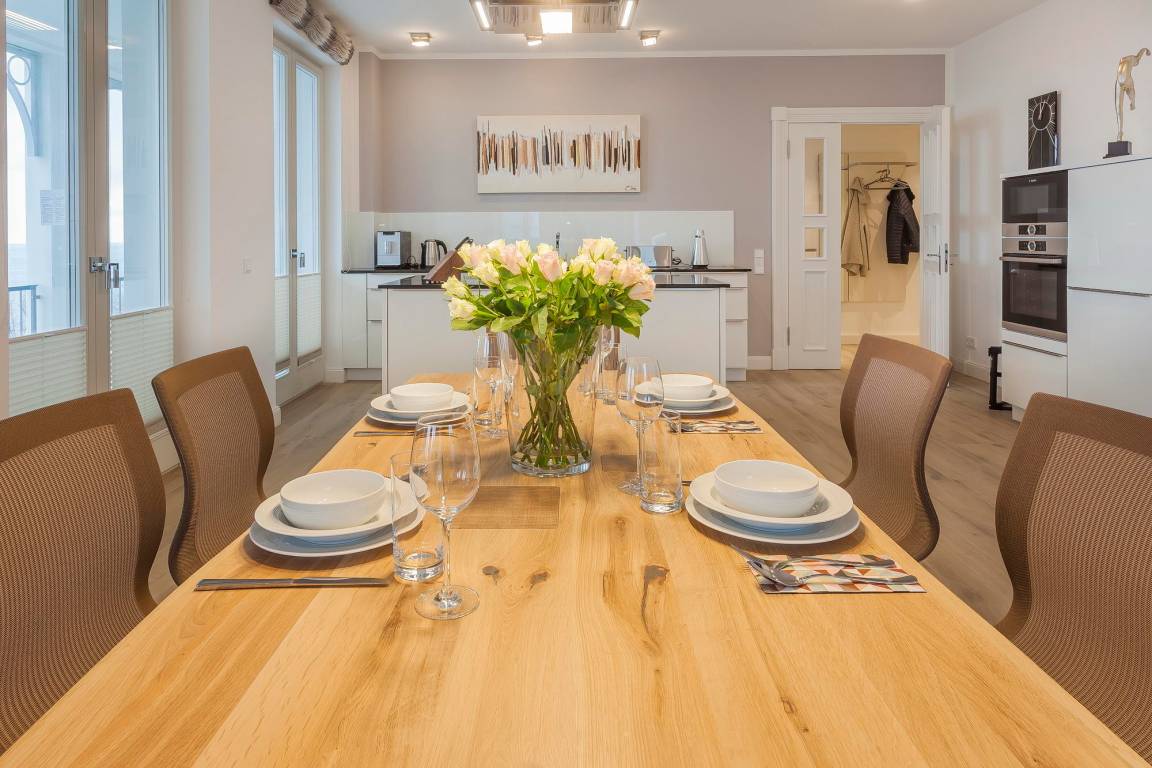 Absoluter Mittelpunkt Ihrer exklusiven Ferienwohnung ist der Wohn- und Essbereich mit seinen großen Fensterfronten, der Meerblick-Loggia inkl. Wintergarten, dem Elektrokamin mit täuschend echt aussehendem Flammenbild und einer Ausstattung, die wohl nichts zu wünschen übrig lässt. Bequeme Couchmöbel laden vor dem riesigen 55 Zoll Fernseher zum Relaxen ein, natürlich mit Funktionen wie Apple TV, Deezer und Netflix. Der elegante Küchenblock von LEICHT ist mit Markengeräten von Bosch, dem passenden Kochgeschirr und edlem Porzellan ausgestattet, so dass Sie sich nach Herzenslust selbst bekochen können, wenn Sie nicht gerade im hauseigenen Restaurant des FIRST oder in einem der netten Lokale in der Nachbarschaft speisen mögen.