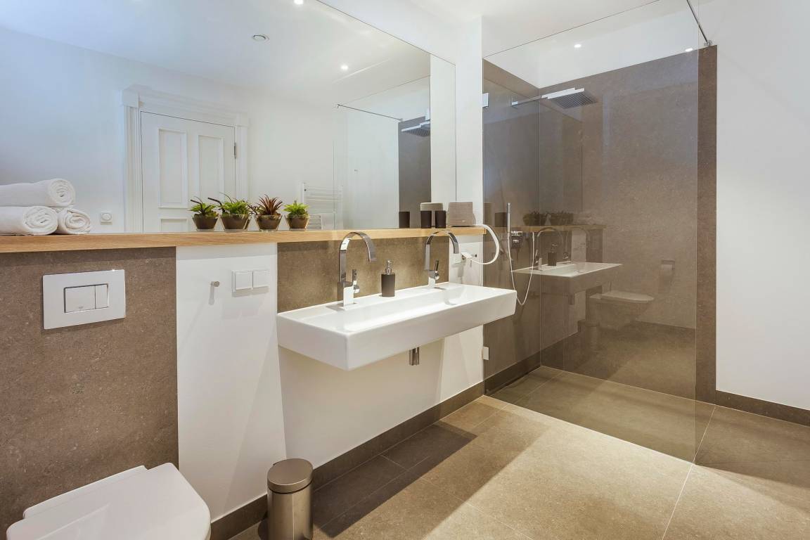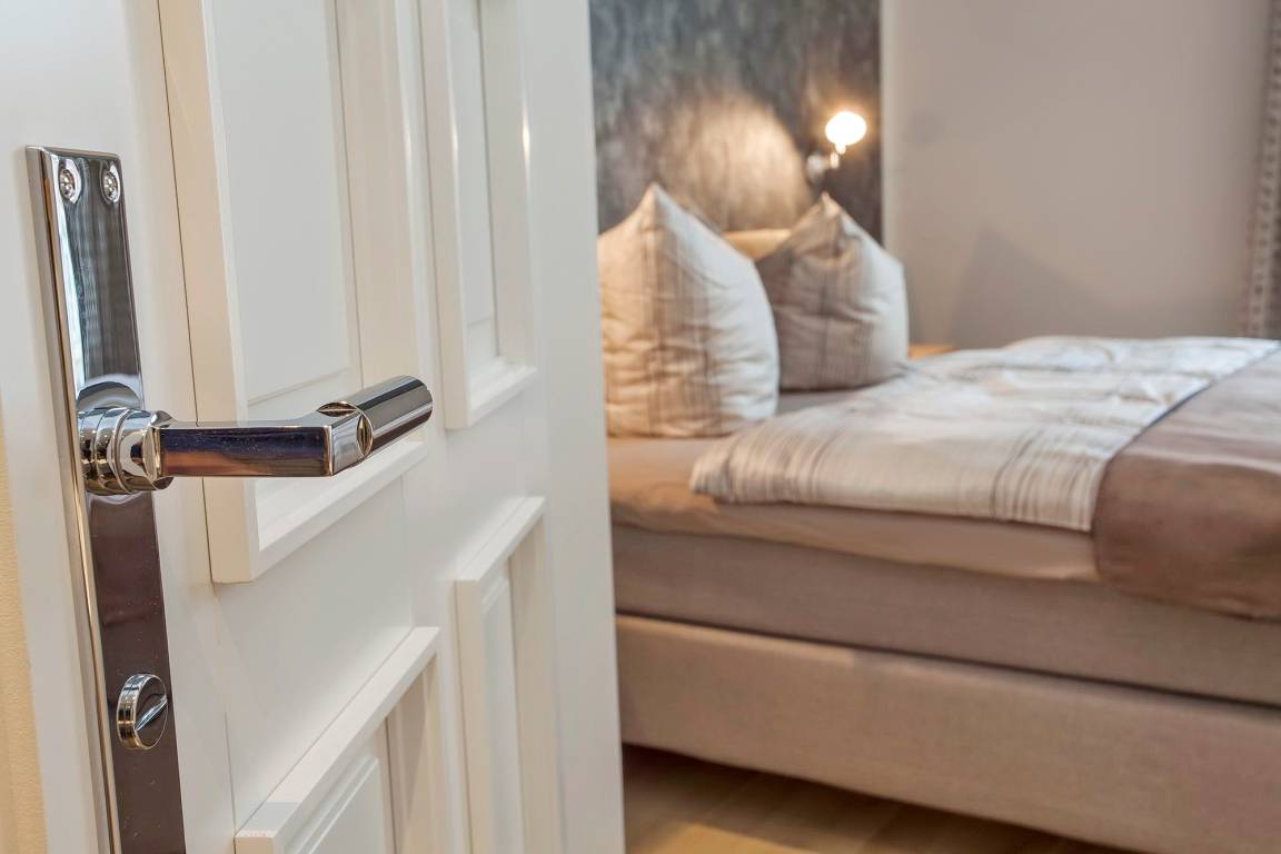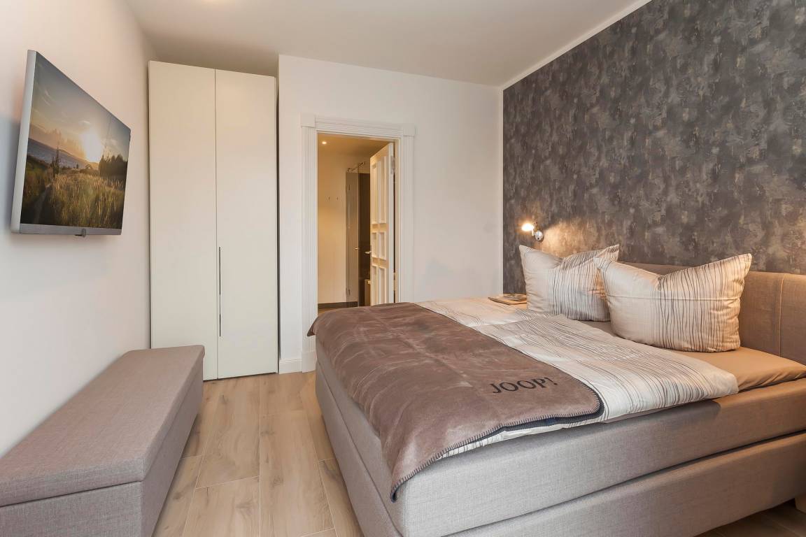 Zwei Schlafzimmer mit standesgemäßen Jensen-Boxspringbetten in 180x200cm, großem Kleiderschrank und 48 Zoll LOEWE-Fernsehern bieten Ihnen den notwendigen Rückzugsraum. Von einem der Schlafzimmer gelangen Sie auf die seeseitige Loggia, das andere Schlafzimmer hat einen Balkon mit Blick auf die Wilhelmstraße. Selbstverständlich lassen auch die beiden elegant gefliesten Badezimmer mit bodentiefer Dusche bzw. Badewanne, großzügigen Waschtischen, Kosmetikspiegel und Handtuchwärmer keine Wünsche offen.