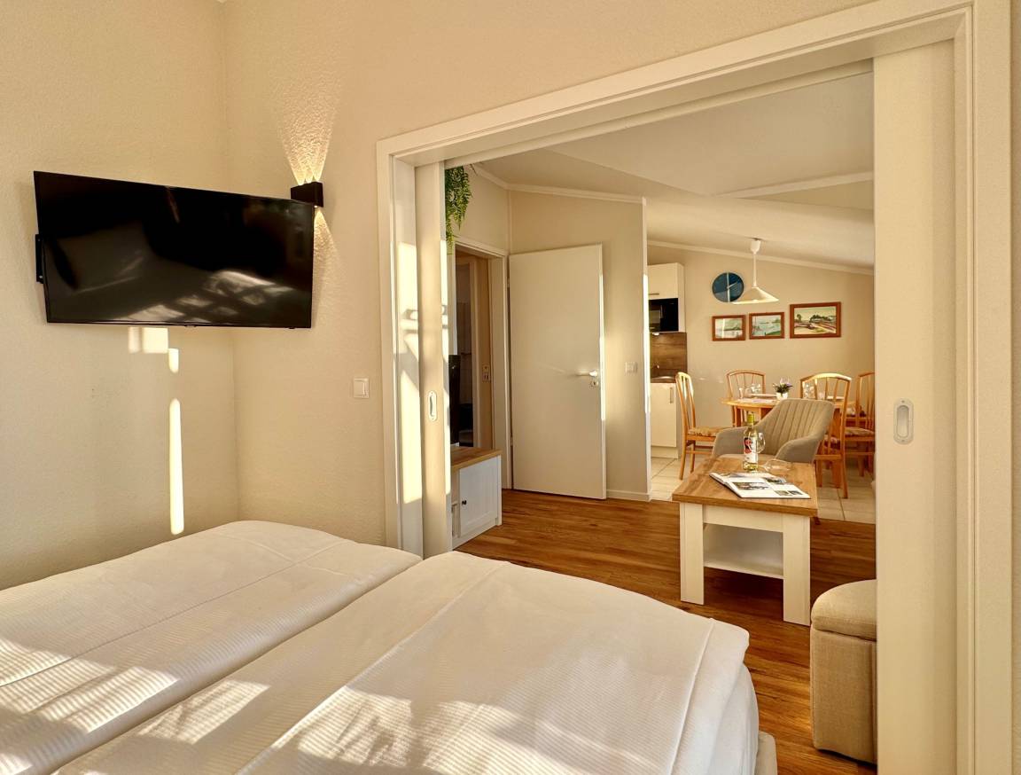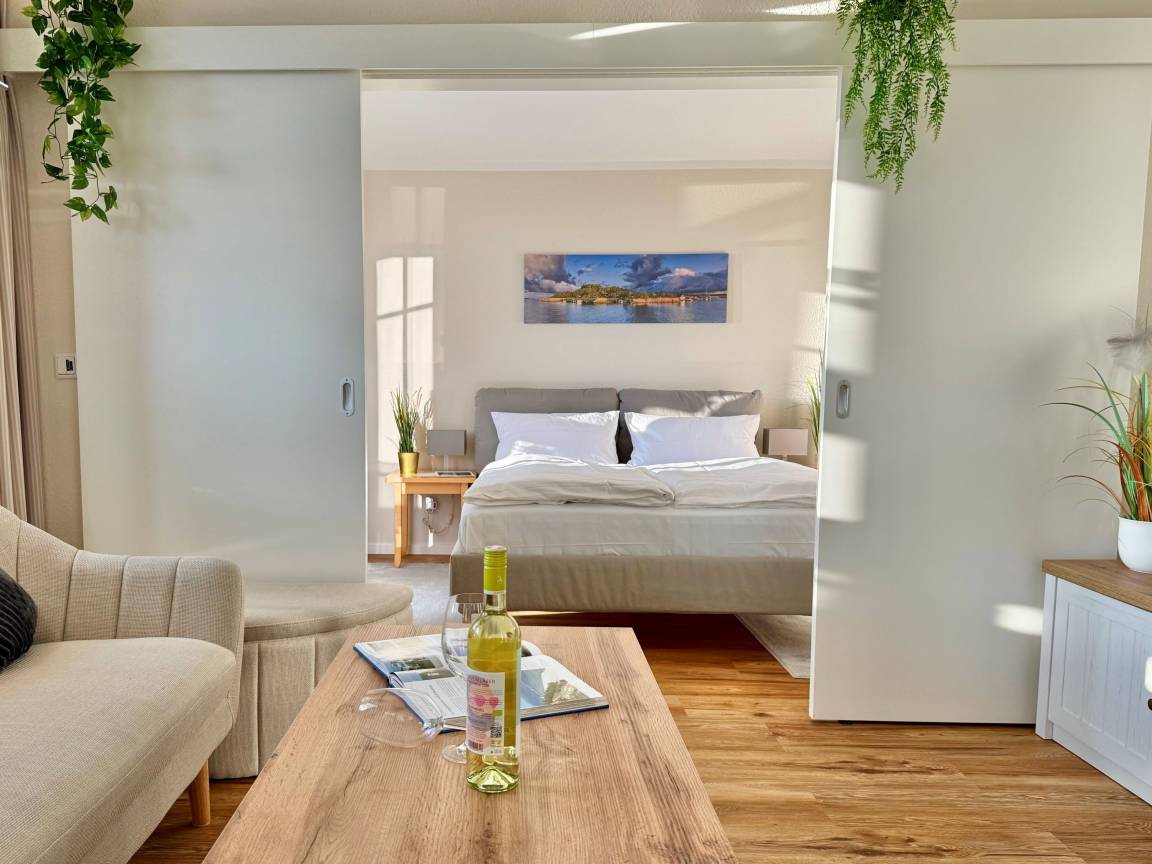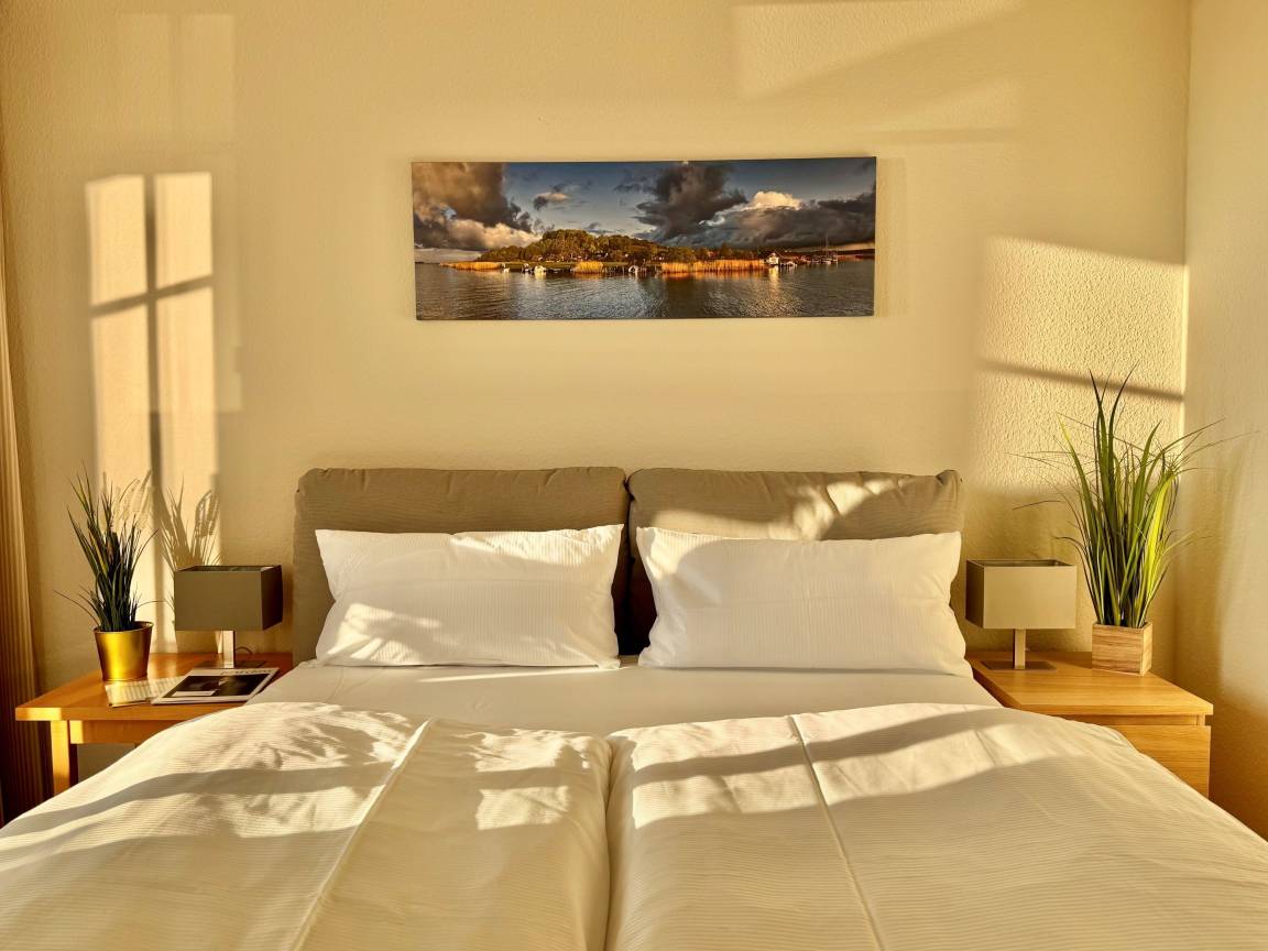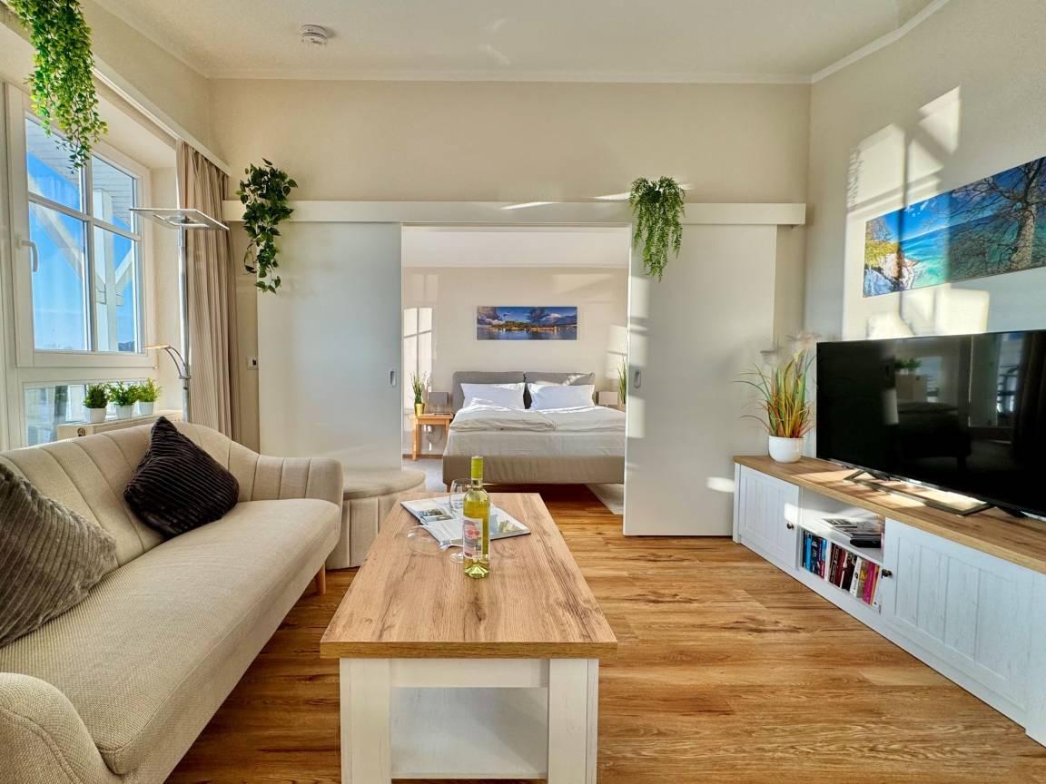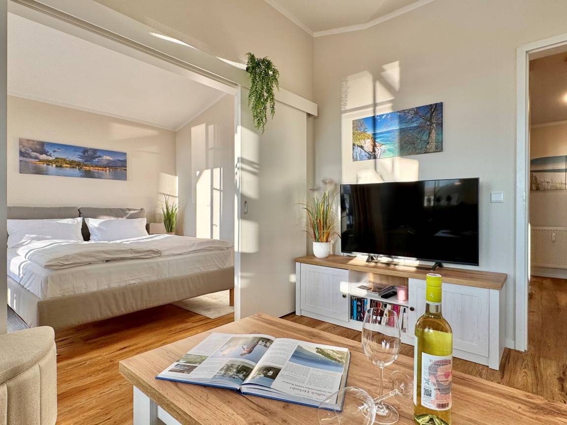 Ein Großteil der Wohnung wurde mit neuem, hochwertigem Mobiliar ausgestattet und präsentiert sich hell, freundlich und zeitgemäß. Der Wohnbereich lädt zum Entspannen ein und verfügt über einen Smart-TV mit Sky-Sendern und Streamingdiensten. Im Schlafzimmer steht Ihnen zusätzlich ein zweites TV-Gerät zur Verfügung, perfekt für entspannte Abende zu zweit.