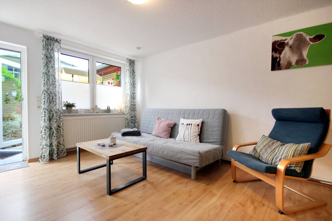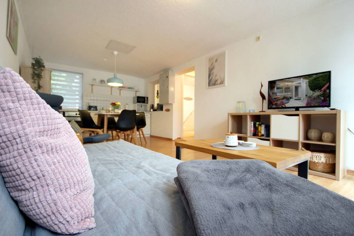 Ihre moderne 2-Raum-Ferienwohnung 66RB1 Julia befindet sich im Erdgeschoss und bietet Ihnen auf ca. 45 qm2 genug Platz für bis zu 3 Personen (Nichtraucher). Eine kleine Südwest-Terasse mit Blick ins Grüne lädt zum Verweilen und Entschleunigen ein. Das Appartement teilt sich auf in einen gemütlichen Wohnbereich mit bequemer Sitzecke mit Schlafmöglichkeit für die 3. Person, Essbereich und Küchenzeile, ein Schlafzimmer sowie ein Tageslichtbad. Neben dem schönen Wohnraum mit Flachbildfernseher, WLAN und Radio, ist der Schlafraum mit einem Doppelbett, Kleiderschrank und einer Kommode ausgestattet. Die Küchenzeile mit Essplatz ist komplett mit Cerankochfeld, Backofen, Mikrowelle, Kühlschrank mit kleinem Gefrierfach, Geschirrspüler, Kaffeemaschine, Wasserkocher, Toaster und weiteren diversen Küchenhelfern eingerichtet. Im modernen Badezimmer erwartet Sie eine Dusche, WC und Fön. Zusätzlichen Stauraum für Ihr Gepäck oder Strandutensilien bietet der wohnungseigene Abstellraum. Ein Haustier ist hier herzlich willkommen (auf Anfrage wären auch zwei Haustiere möglich)! Ein PKW-Stellplatz steht Ihnen direkt am Objekt zur Verfügung.