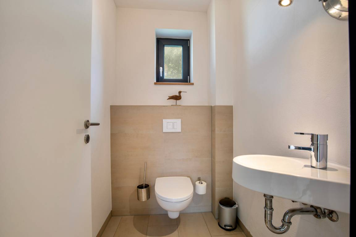 Im Obergeschoss befinden sich die drei Schlafzimmer Ihres Urlaubsdomizils, dazu ein Gäste-WC und ein geräumiges Badezimmer mit Dusche und Badewanne sowie einem Dachfenster, durch das Sie beim Baden den abendlichen Sternenhimmel genießen können.