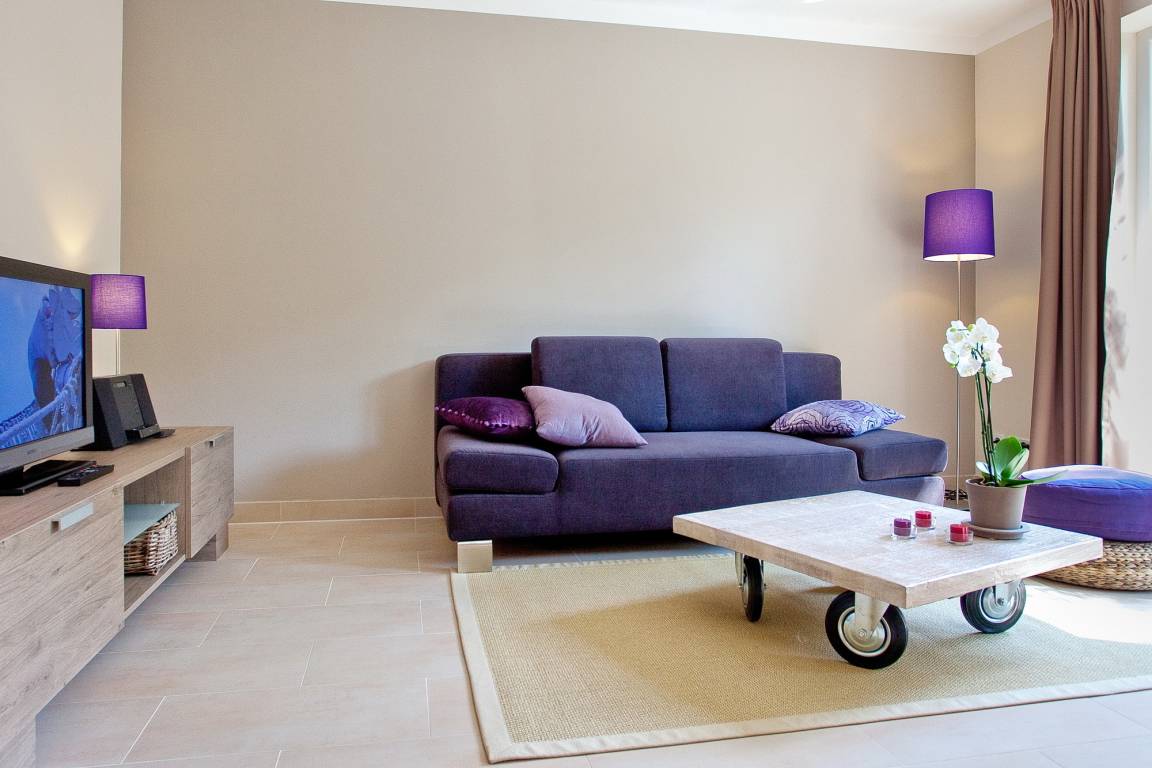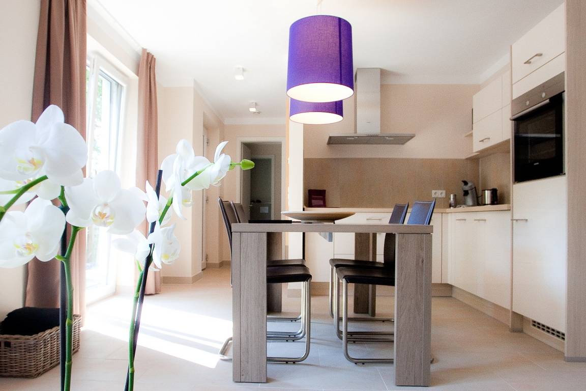 Hier lässt es sich wohlfühlen und die Urlaubszeit in angenehmer Atmosphäre verleben! Ihr Ferienhaus (Doppelhaushälfte) besticht mit seinem stilvollen Ambiente, durch Möbel in schönem Design und in einer harmonischen Farbauswahl. Eine Fußbodenheizung sorgt rund ums Jahr für ein wohliges Raumklima. Die moderne Küchenzeile im kombinierten Wohn- und Esszimmer wurde mit hochwertigen Markengeräten und allem notwendigen Geschirr ausgestattet. Vor dem großformatigen Flachbild-TV und dem flackernden Feuer im Kaminofen lässt es sich wunderbar entspannen. Die verwandelbare Couch bietet Platz für ein Kind bis 10 Jahren, so dass sich maximal vier Erwachsene und zwei Kinder im Haus erholen können.