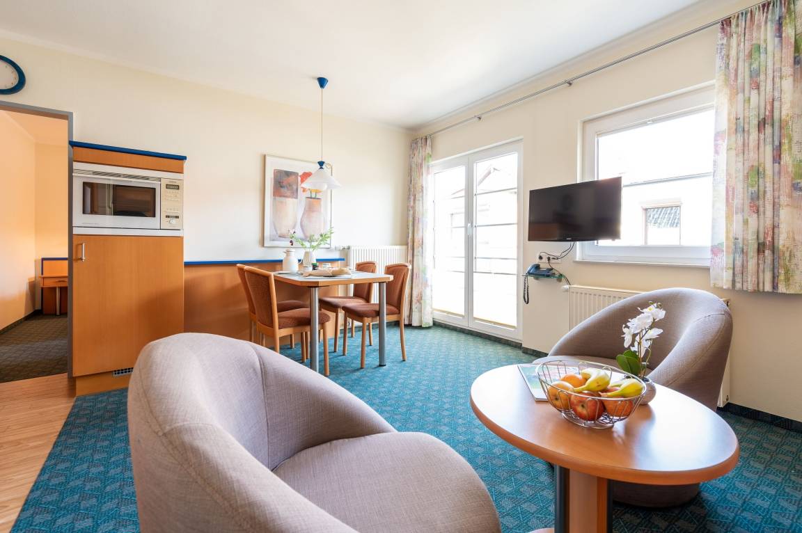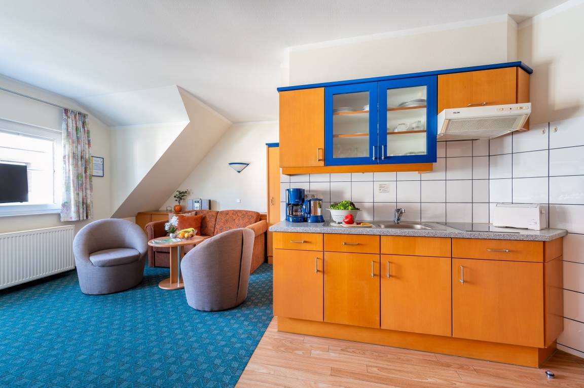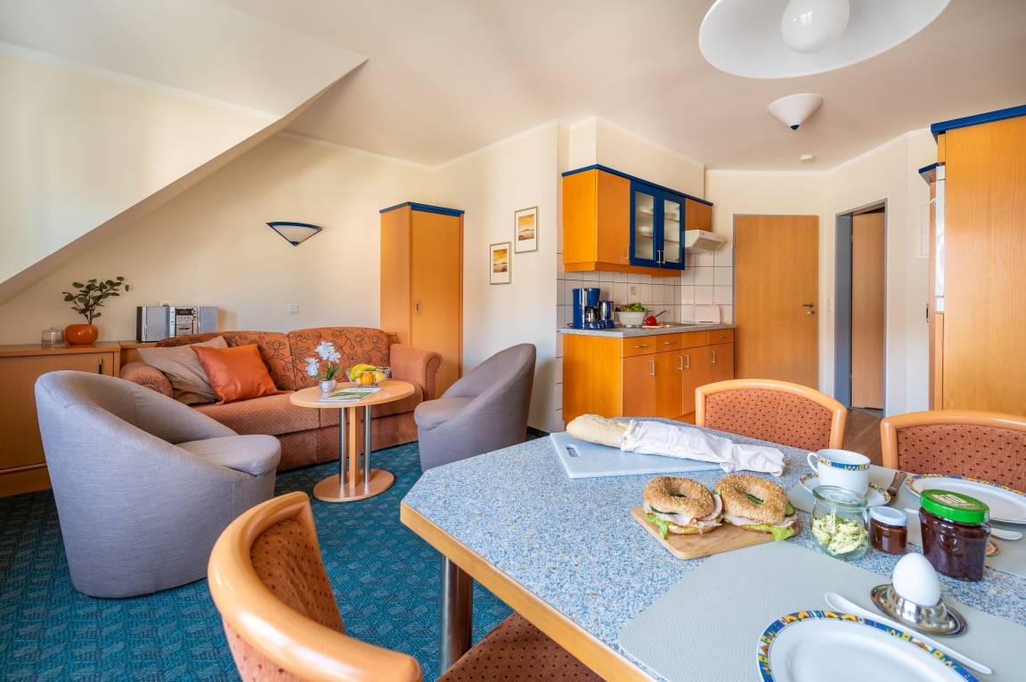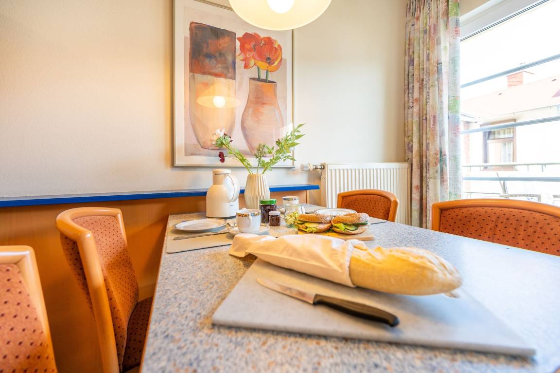 Die freundlich eingerichtete Wohnung 3 in der Ferienanlage Margaretha ist ca. 42 m² groß und für bis zu 2 Personen ausgelegt.