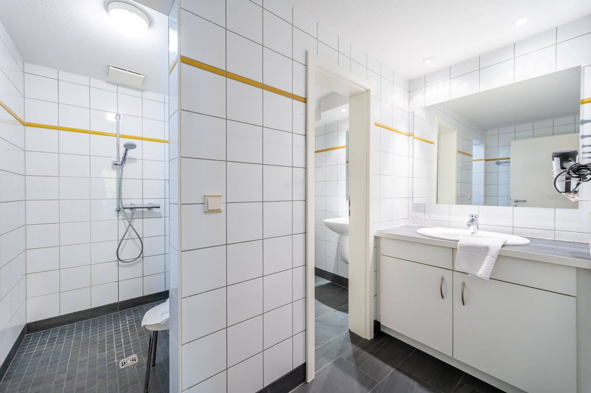 Im Schlafbereich steht ein komfortables Doppelbett und ein geräumiger Kleiderschrank bereit. Im hell erleuchteten Badezimmer befindet sich eine bodengleiche Dusche und ein separates WC.