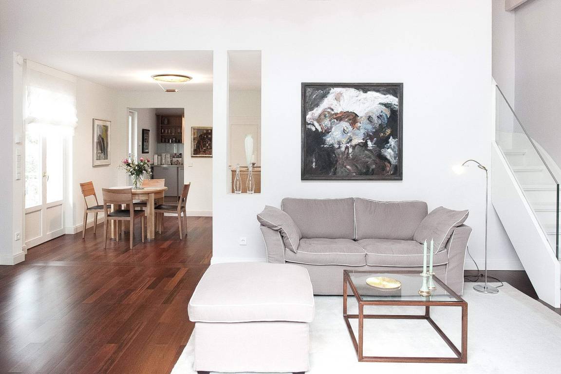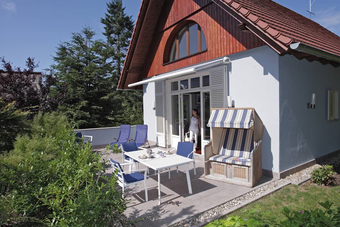 Die beheizbaren Fußböden sind mit Shivakashi-Granit oder Parkett belegt. Im Eingangsbereich stehen Ihnen ein Hauswirtschaftsraum mit Waschmaschine und Trockner und ein Gästebad mit Dusche/WC zur Verfügung. Von der Eingangsdiele aus gelangen Sie einerseits in das stilvolle Arbeitszimmer mit einem Schreibtisch mit Internet-W-LAN-Anschluss und einer eleganten Couch, die auch zum Schlafen geeignet ist. Andererseits gibt es vom Eingangsbereich auch den Zugang zum wunderschönen lichtdurchfluteten Wohnraum über 2 Ebenen, der ein ganz besonderes Raumerlebnis vermittelt. Hier befindet sich auch der Essbereich mit dem Zugang zum Balkon zur Abendsonne und mit der offenen Küche, die harmonisch in den Wohnbereich integriert wurde. Diese Küche ist mit modernsten Geräten ausgestattet, wie zum Beispiel einem Induktionskochfeld mit Dunstabzugshaube mit Außenentlüftung, einem Backofen, einer Mikrowelle, einer Geschirrspülmaschine und diversem Kleininventar, das die vorzügliche Ausstattung vervollständigt und auch die Ansprüche ambitionierter Hobbyköche erfüllt. Der großzügige Wohnbereich mit der wohnlichen Sitzgruppe und einem modernen Flachbild-TV verfügt auch über den Zugang zur großen Südterrasse. Diese bietet genügend Platz zum Entspannen auf formschönen, bequemen Gartenmöbeln oder im Strandkorb und erlaubt einen schönen Blick in den gartenarchitektonisch angelegten Außenbereich. Hier befindet sich auch die sonnige Liegewiese.